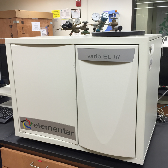 The Elementar EL Cube CNS Elemental Analyzer quantifies total carbon, nitrogen, and/or sulfur in solid samples.