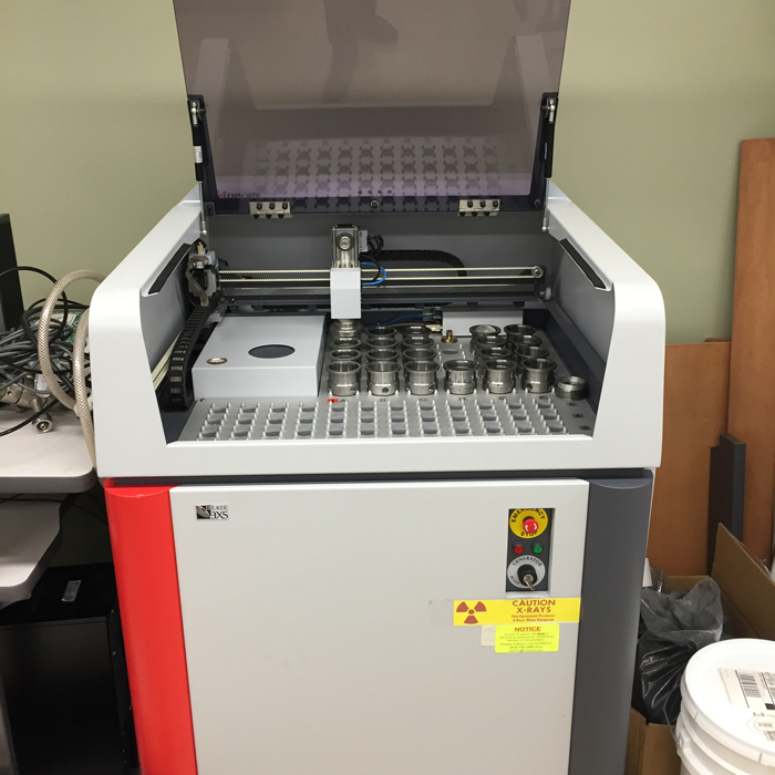 The Rigaku Primus IV wavelength-dispersive X-ray fluorescence spectrometer measures elemental concentrations from parts-per-million to weight percent. Samples are typically made into a glass fusion bead. Almost any material that can be prepared in this manner can be analyzed by the XRF. Analysis of pressed pellets or dissolved samples is also possible as is spatial mapping of small thin discs. A built-in auto-sampler allows for unattended operation.