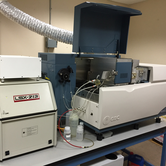 The Agilent 5900 ICP-OES (inductively-coupled optical emission spectrometer) measures concentrations of inorganic elements into the part-per-billion (ppb) level as well as isotopic ratios. An auto-sampler allows for unattended operation.