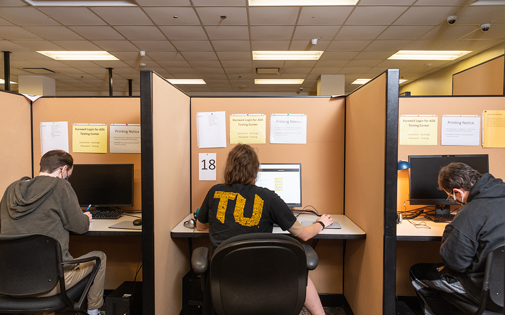 Final exams are taken in the ADS Testing Center (Cook 321) or a remote space in Cook Library. Remote spaces are other rooms in the library that emulate the Testing Center through the use of white noise machines, clocks, earplugs, privacy shields, and ADS proctors to monitor and assist testers throughout the exam. Due to the volume of testers during finals, seats in the ADS Testing Center are reserved for typed/online exams or technology-based accommodations that cannot be provided in a remote space.