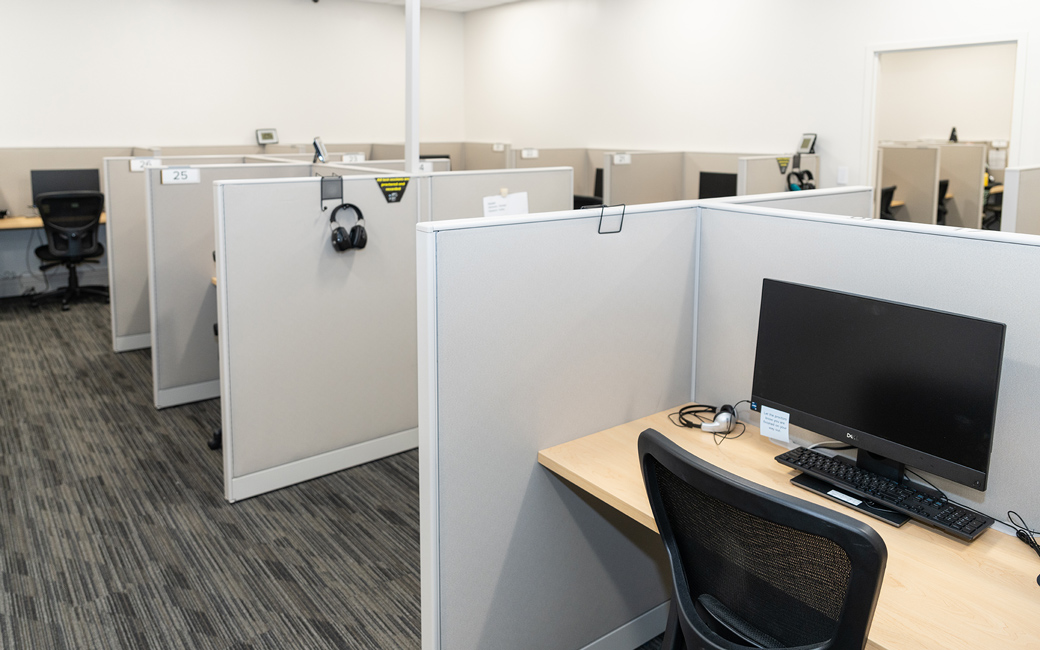 The facility features 34 computer stations with privacy partitions and utilizes white noise machines, noise-canceling headphones, and earplugs to provide a reduced distraction testing environment.