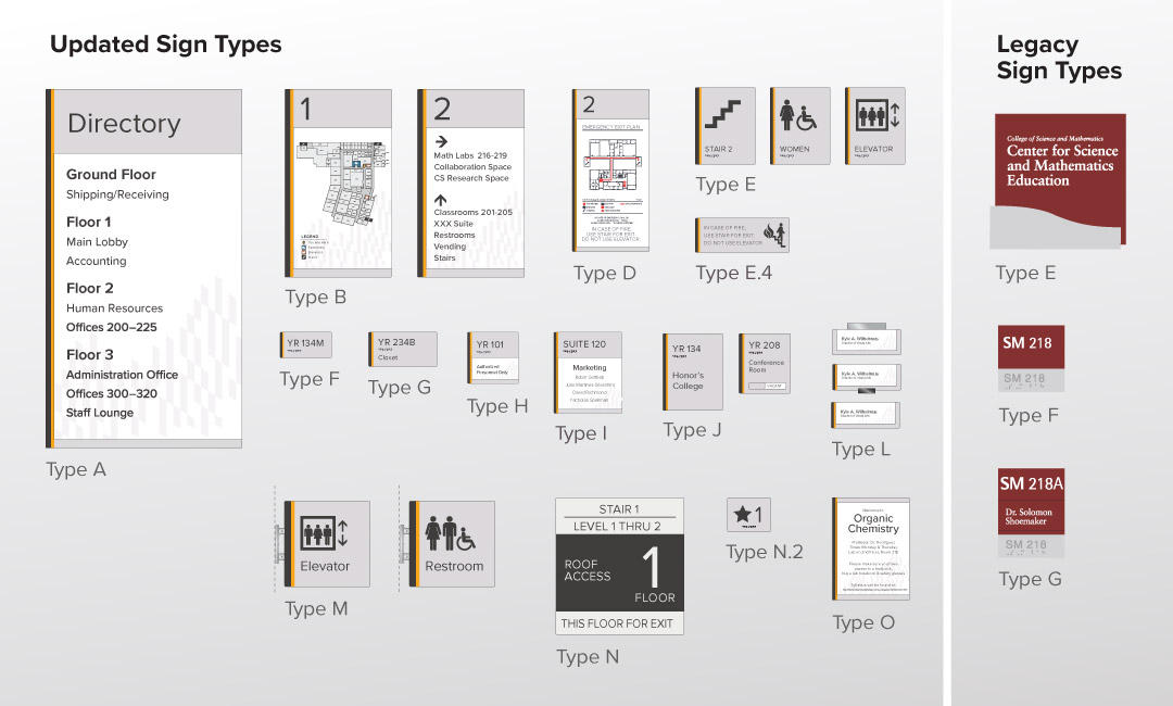Interior campus signage designs have been developed and are being phased in across campus systematically. The designs were created to complement university’s visual branding in a more subtle manner, allowing the focus to be on the information. Most signs include room for an insert to accommodate content that changes over time. Inserts for larger signs are created by Design and Graphic Services; Smaller sign inserts — for sign types H, I, L and O — can be formatted in Marq.