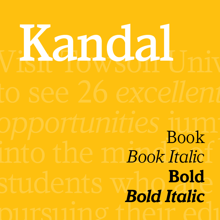 Our typography provides additional style and consistency to the university’s brand. TU uses two primary typefaces to help bring character and personality to every word we choose: Proxima Nova and Kandal. The geometric sans serif typeface Proxima Nova and wedge serif typeface Kandal complement one another when paired together.