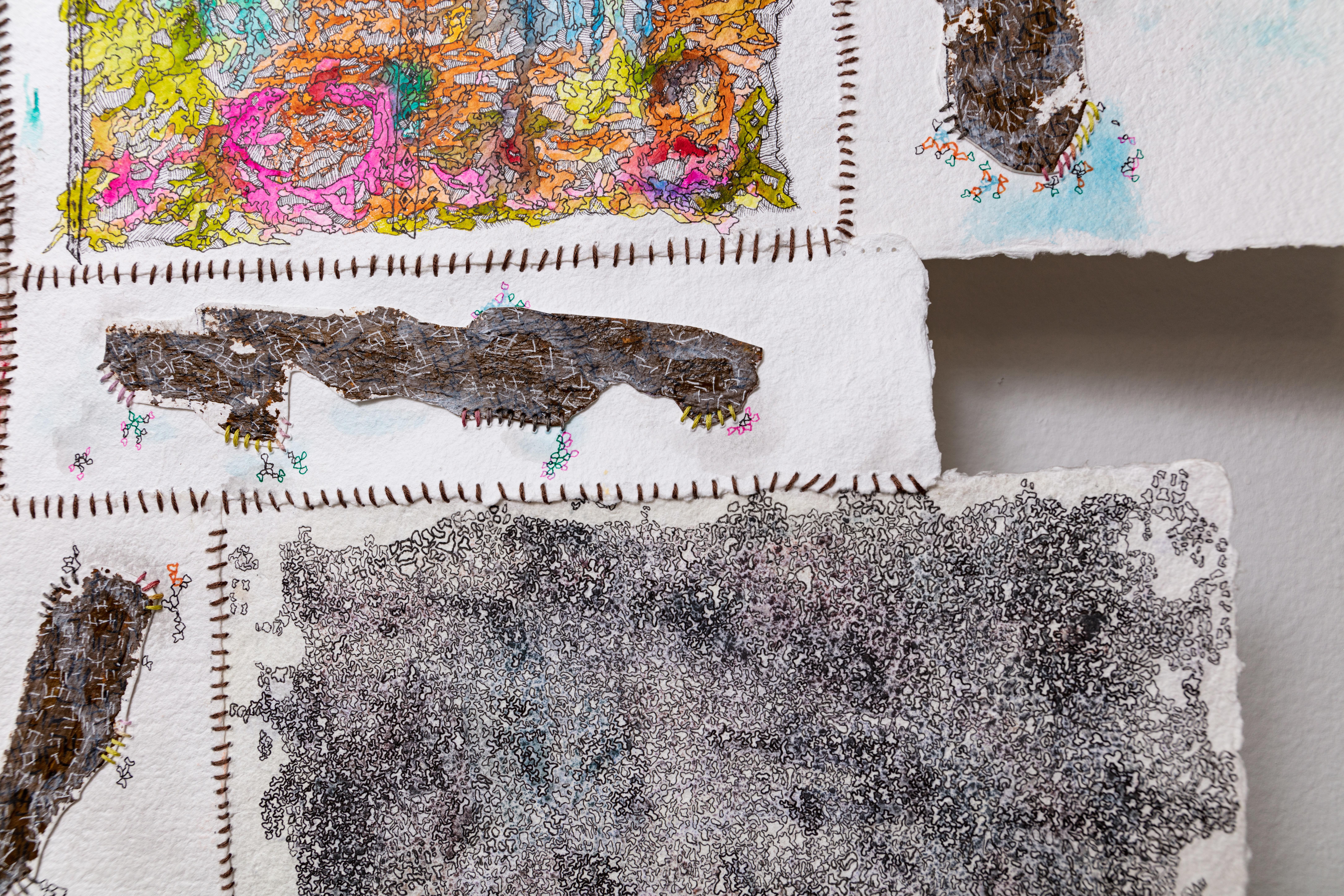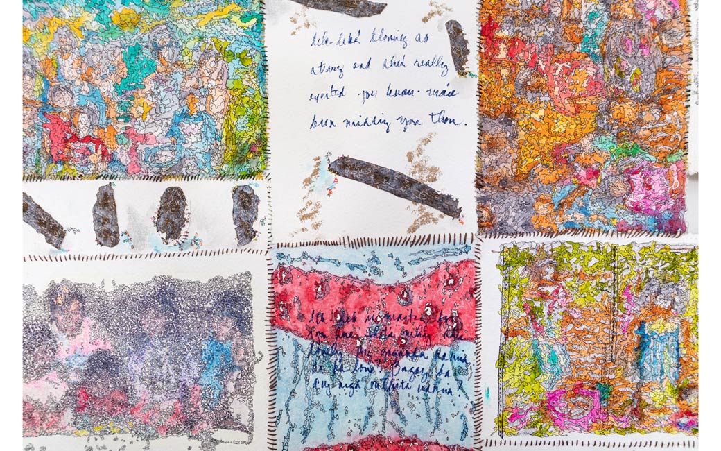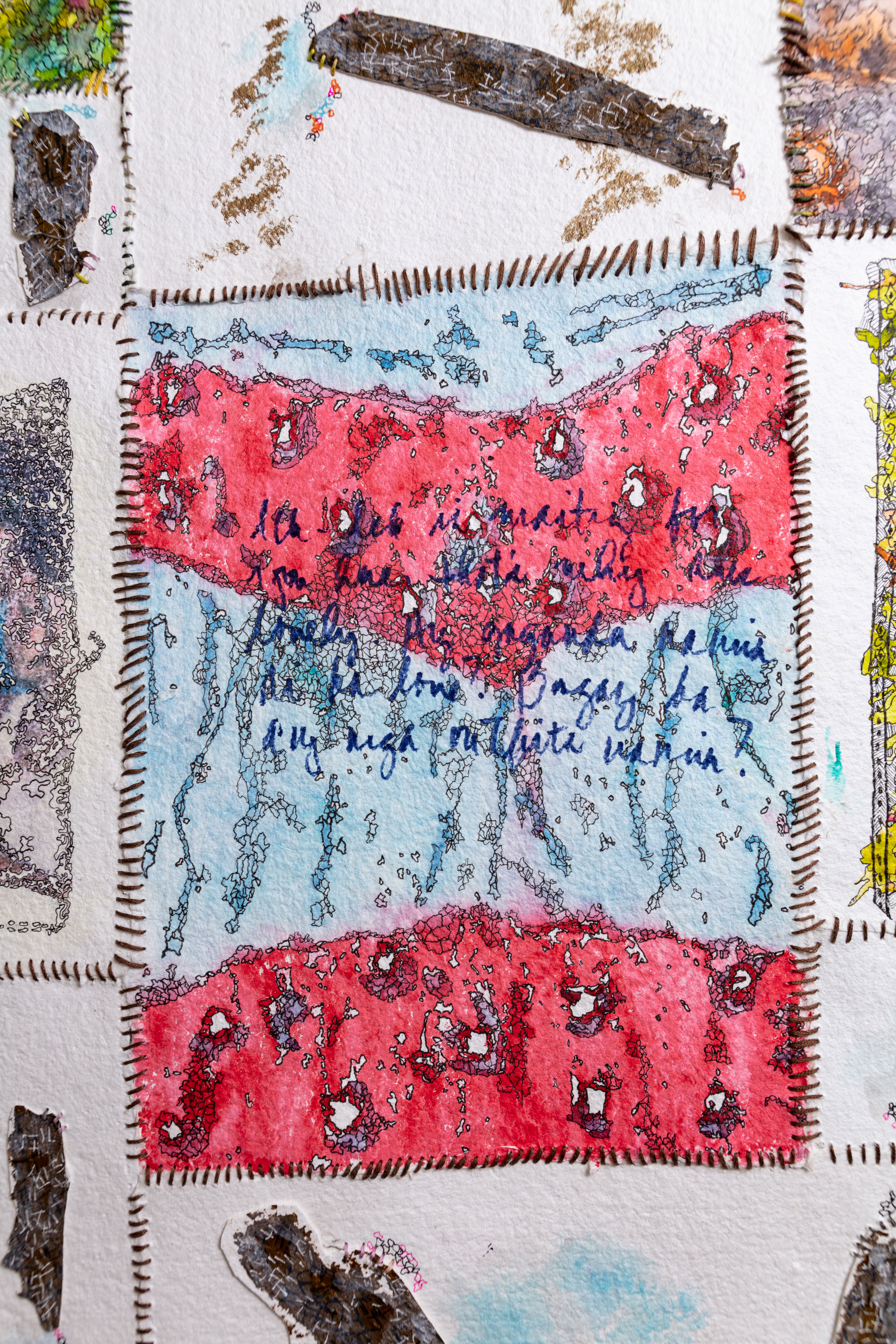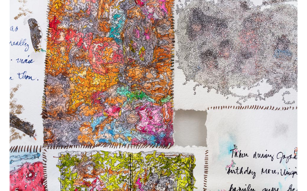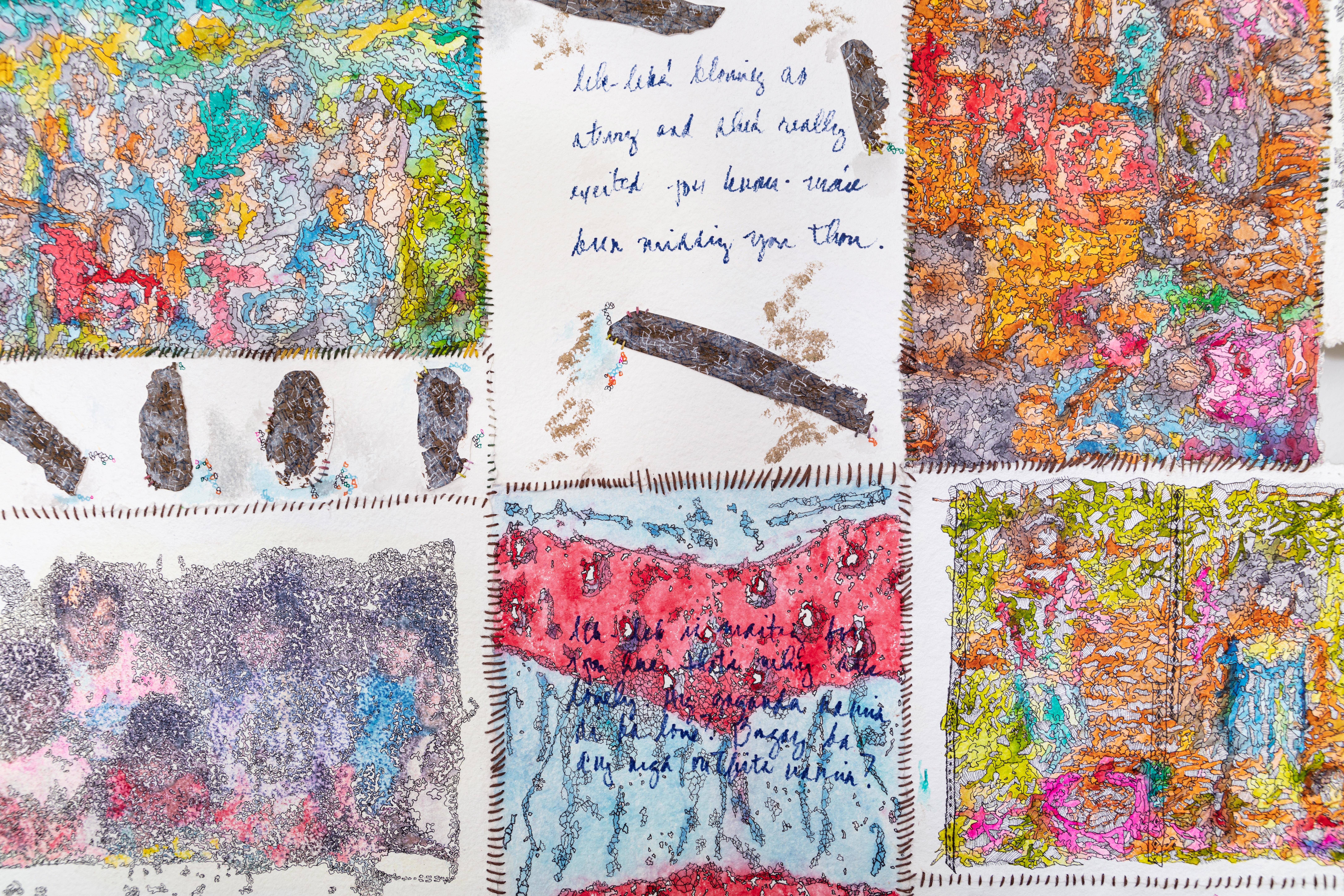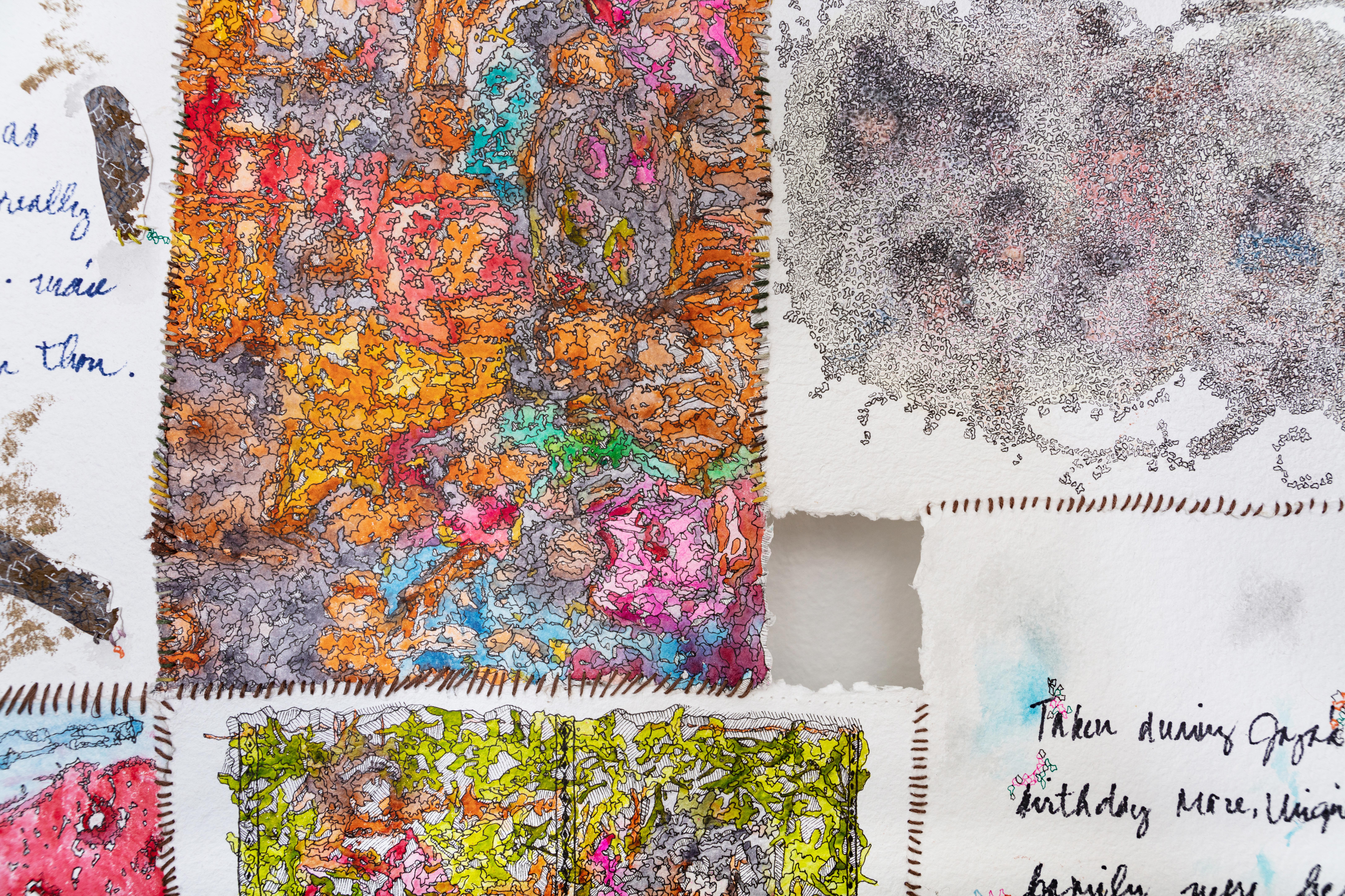 Ink, watercolor, marker, photo printed on transparency paper, digital collage, thread