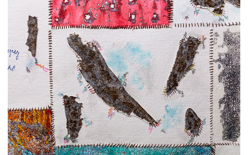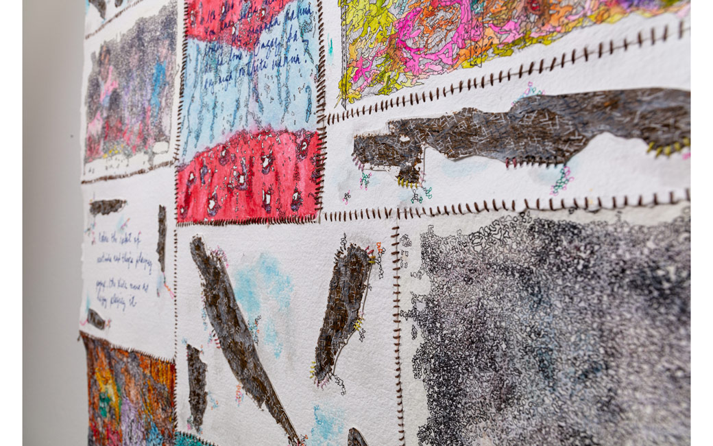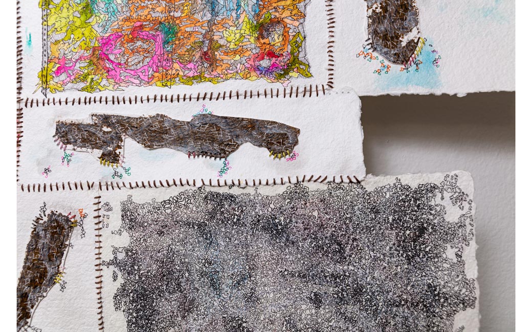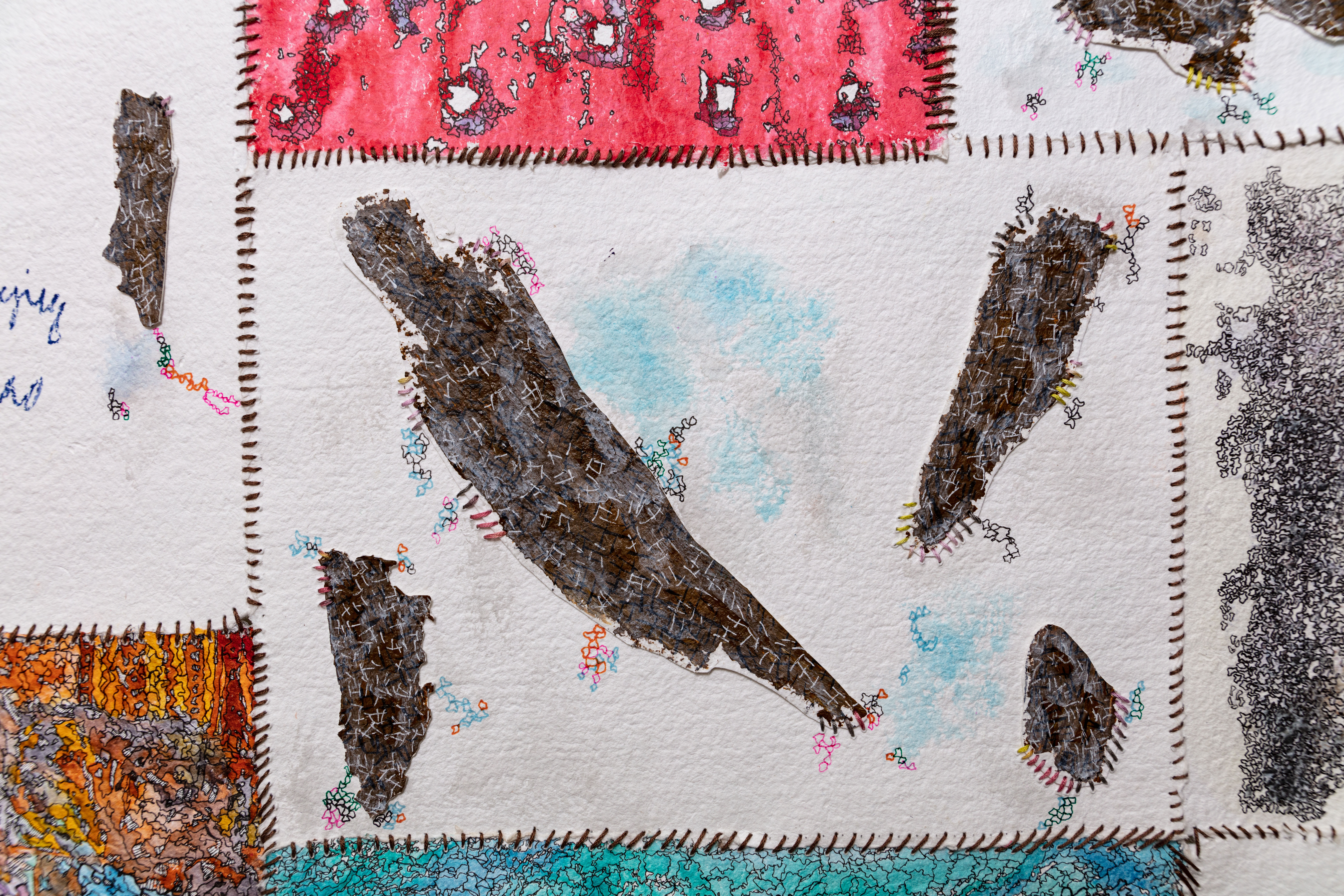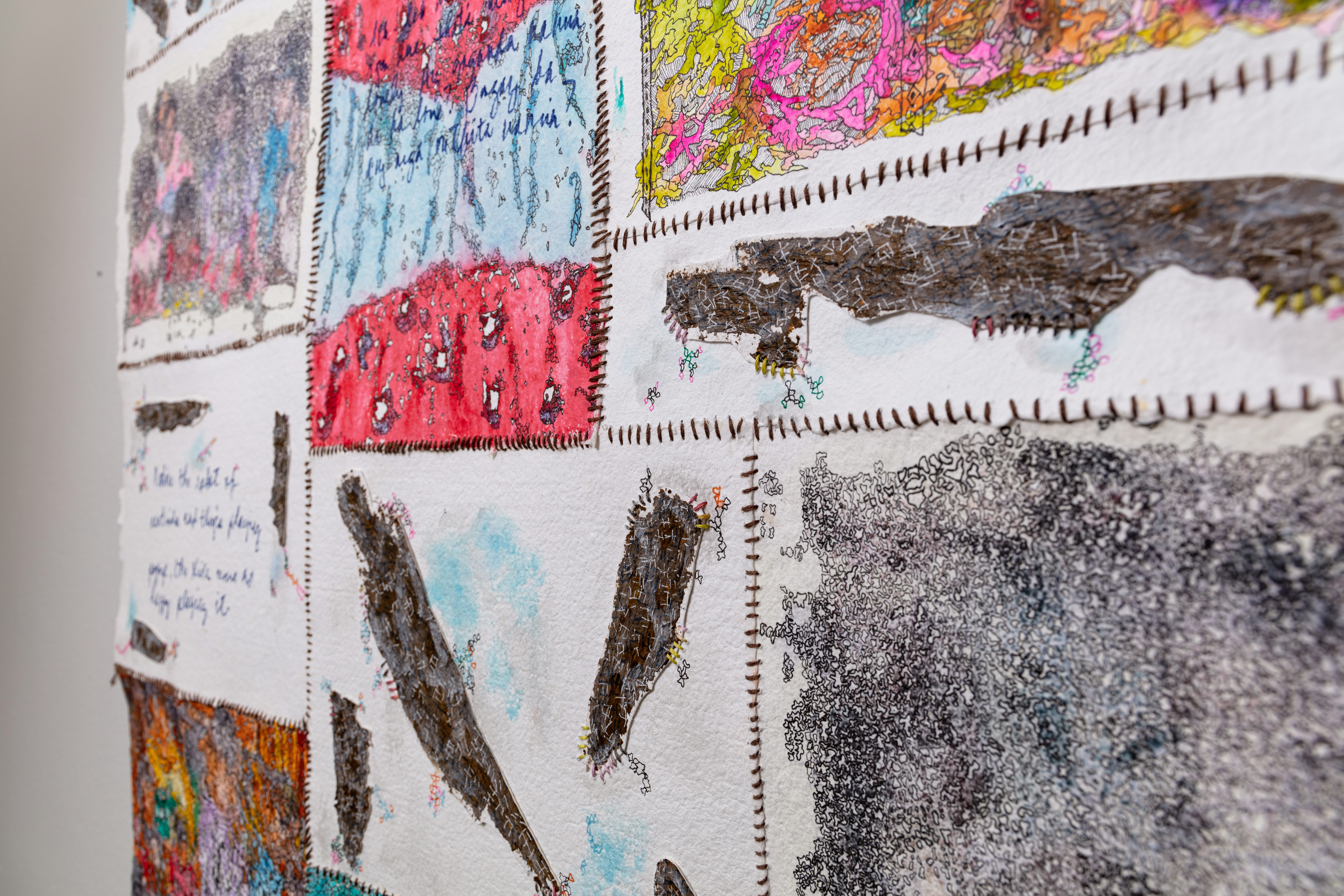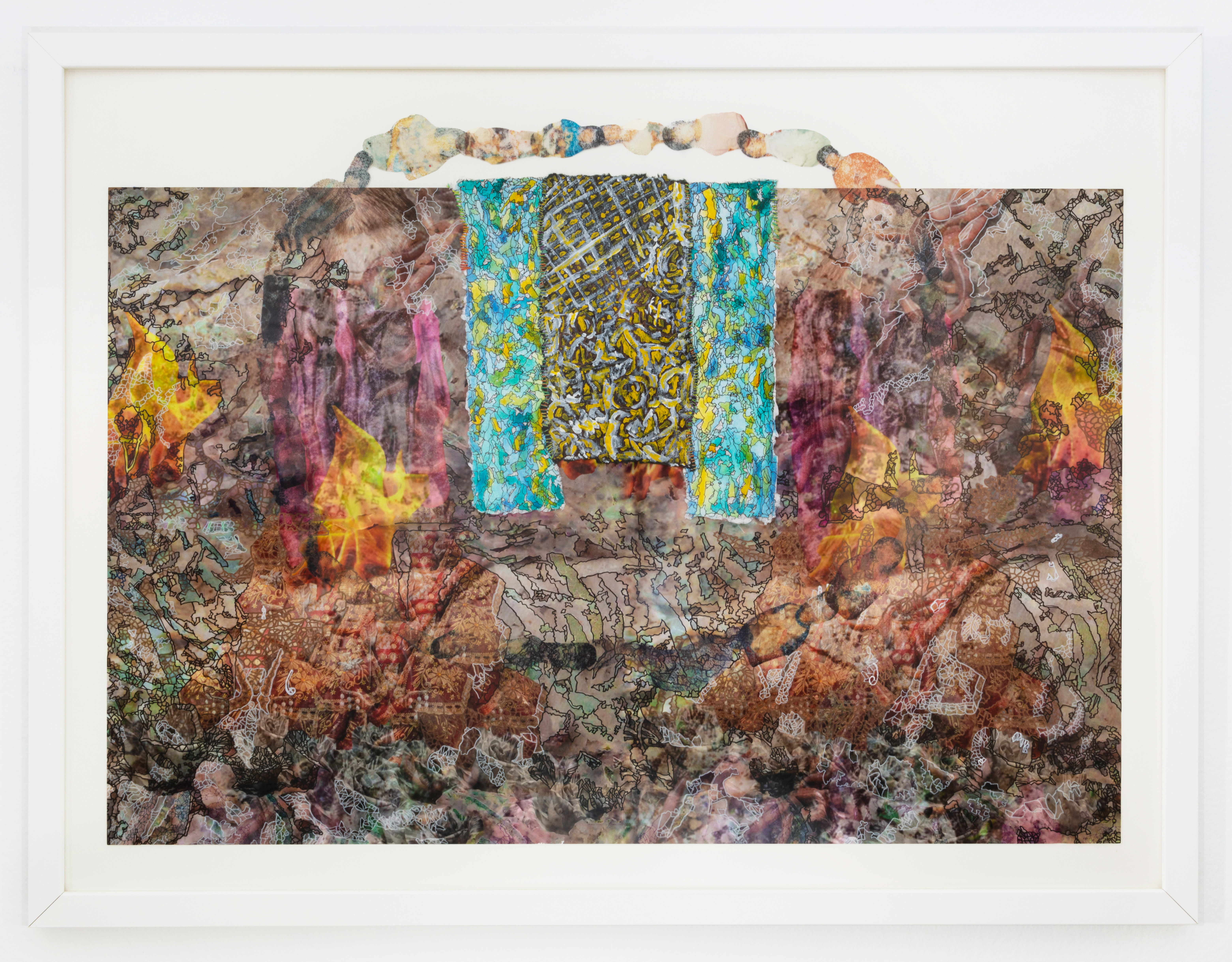Ink, watercolor, marker, photo printed on transparency paper, digital collage, thread