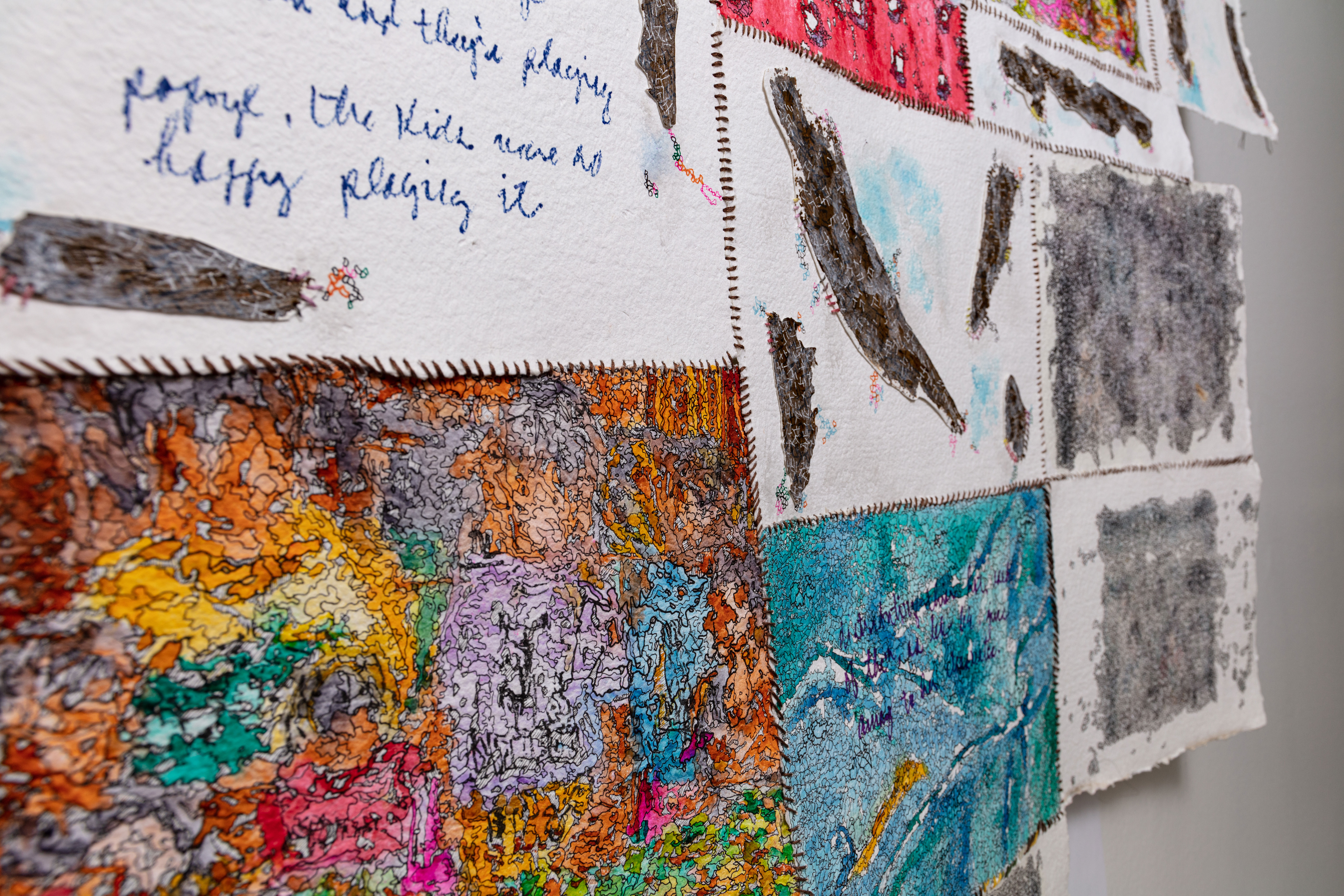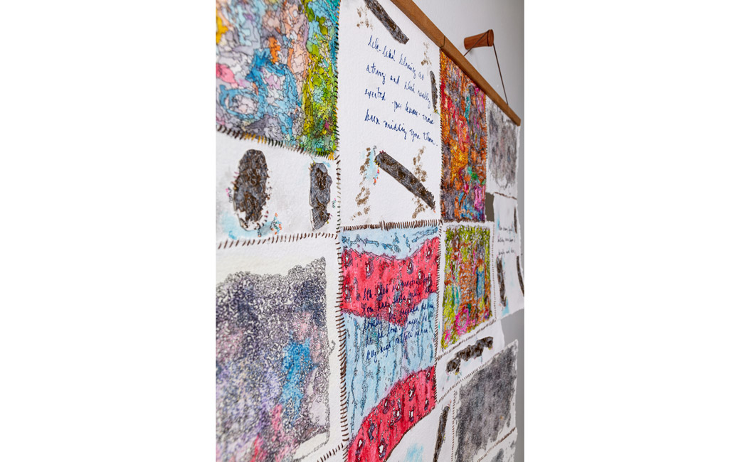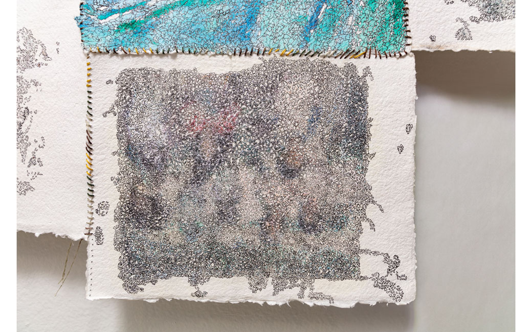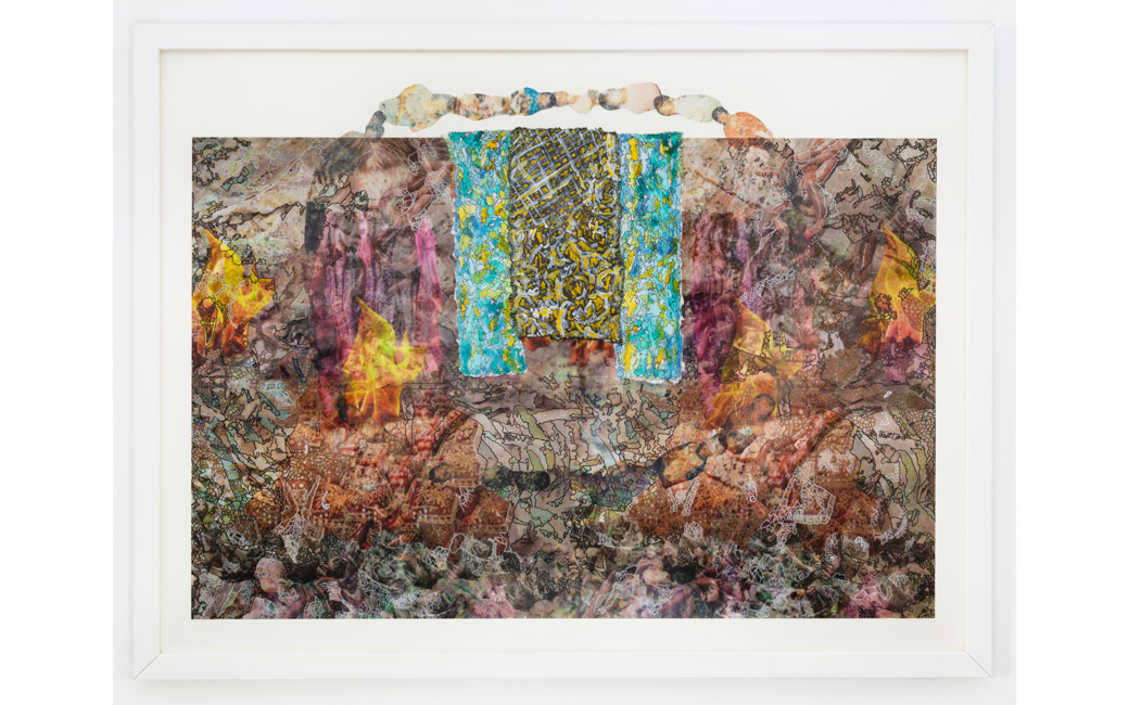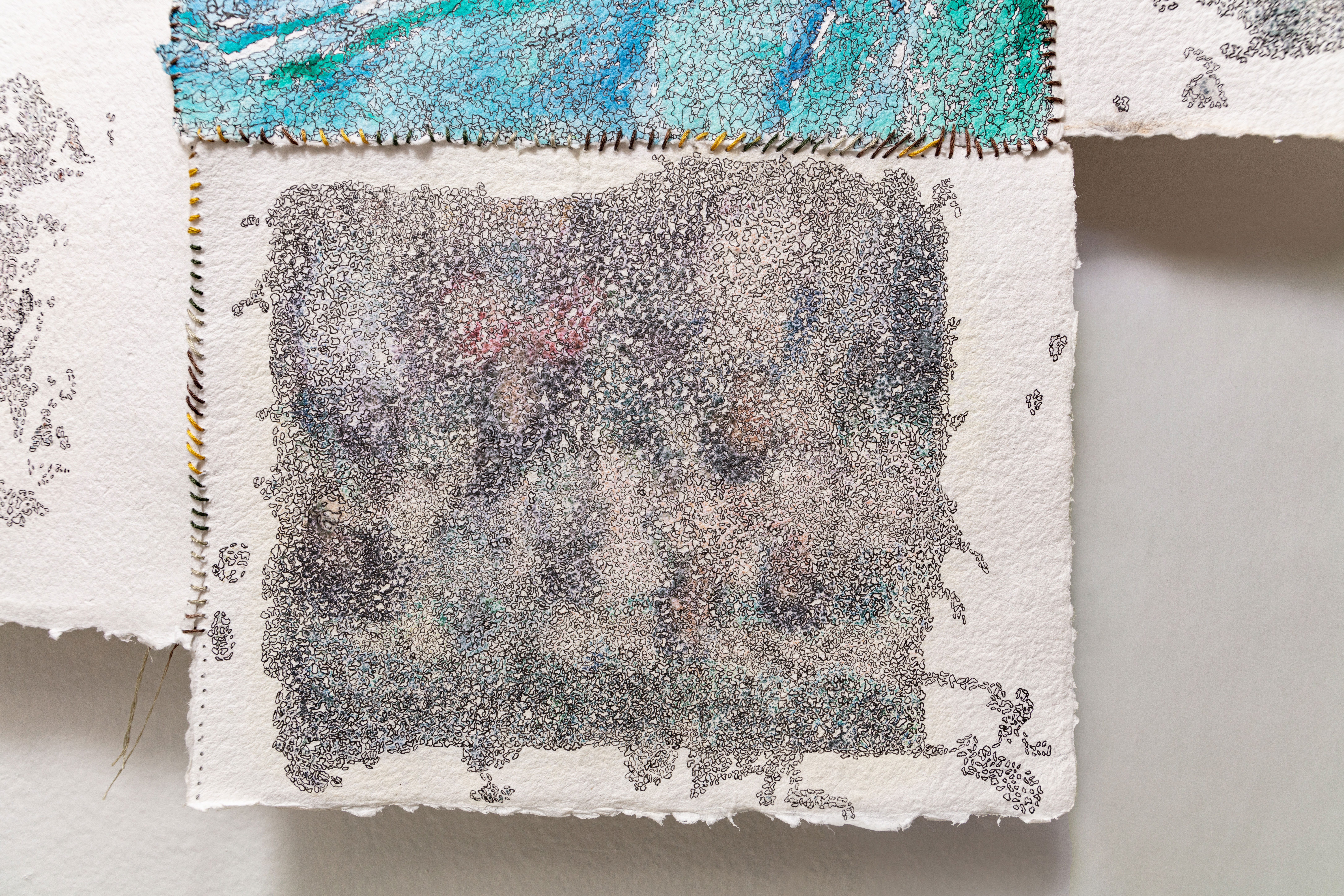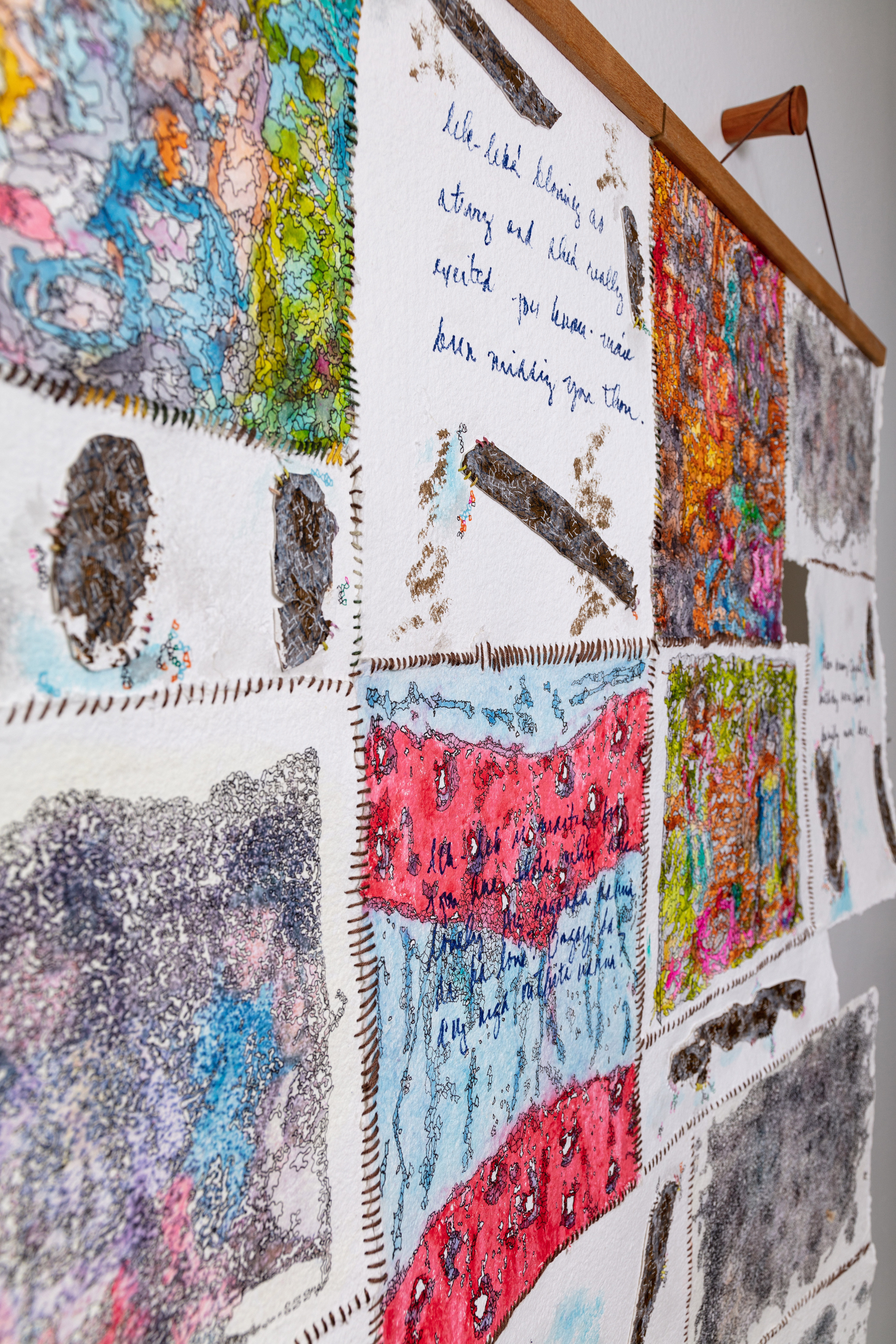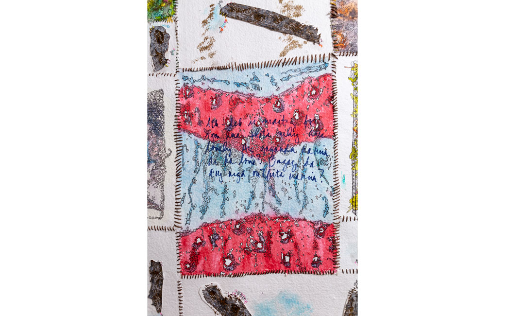 Ink, watercolor, marker, photo printed on transparency paper, digital collage, thread