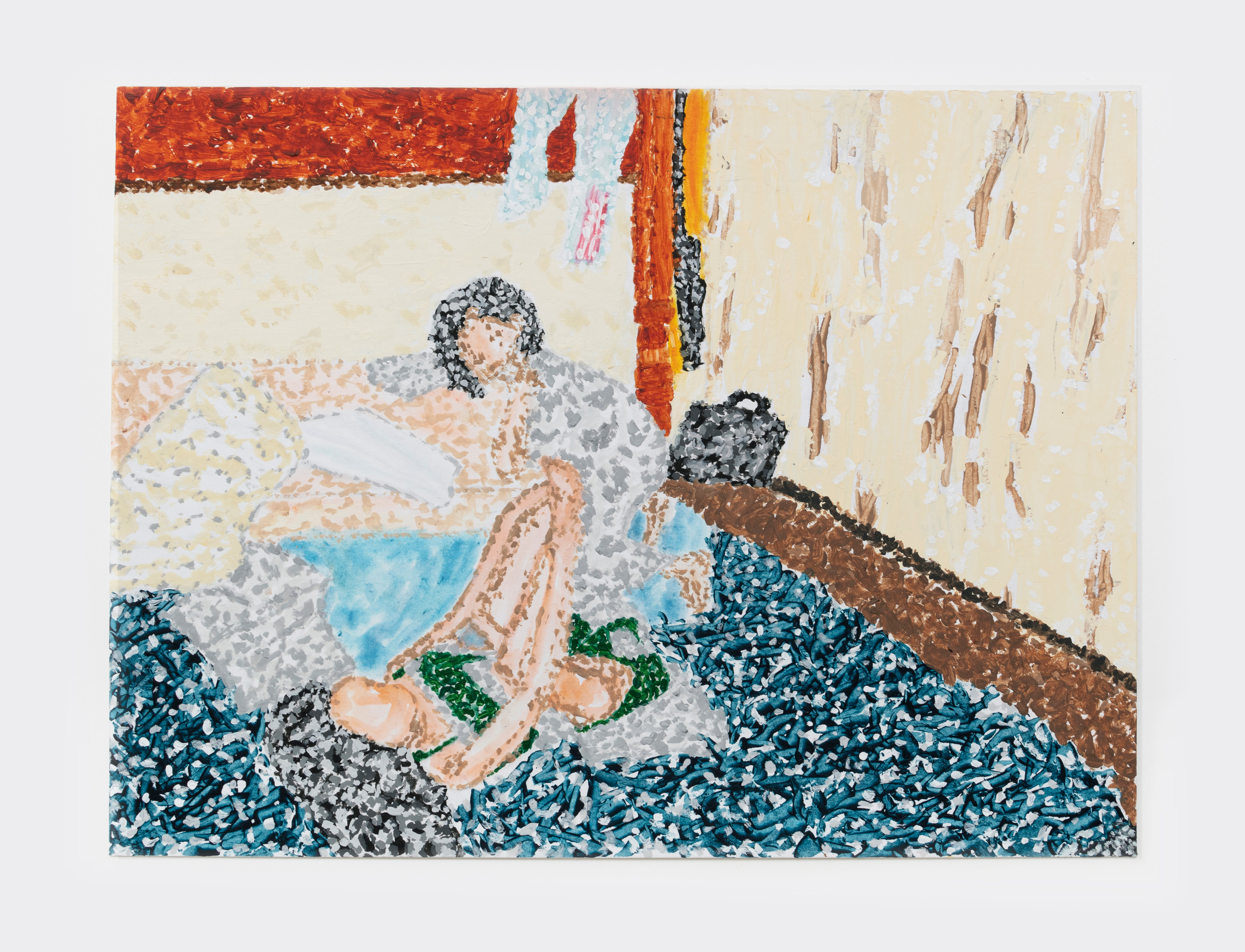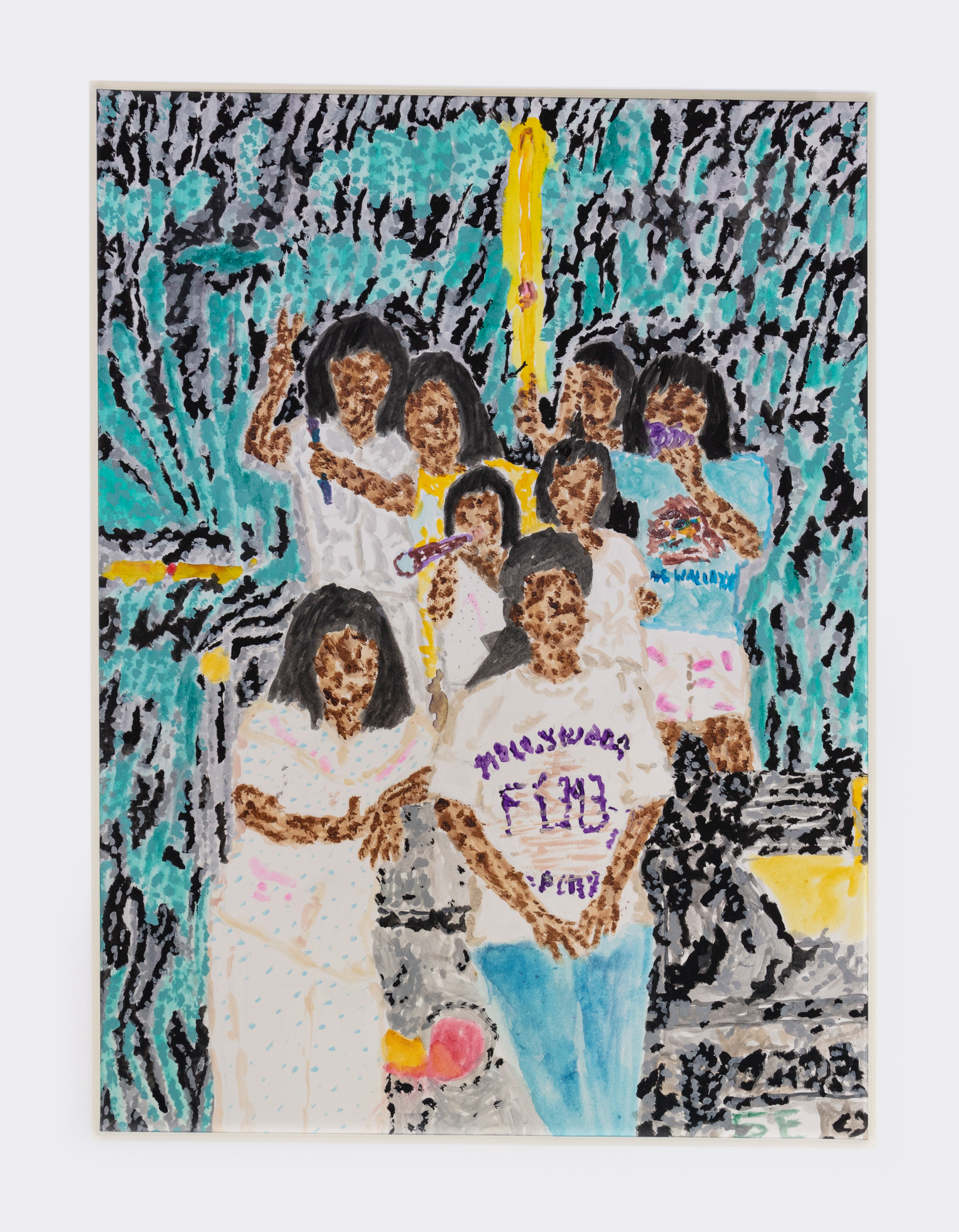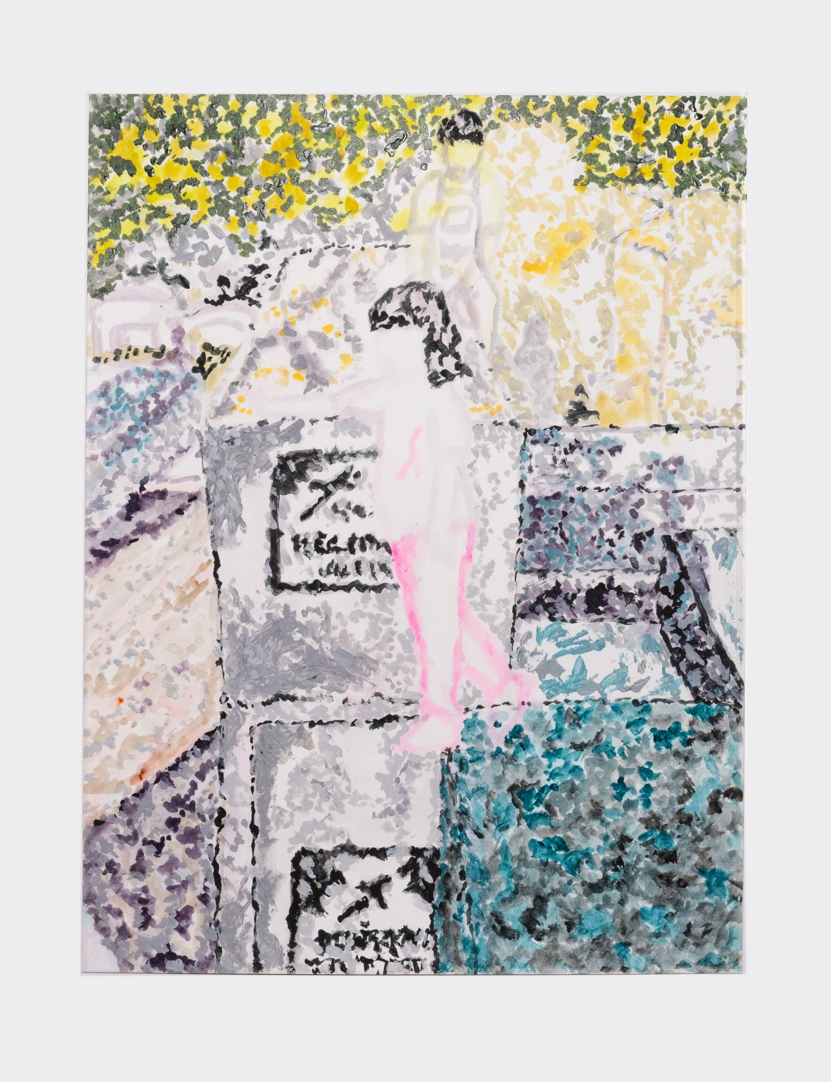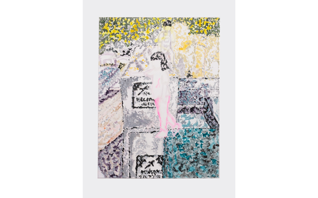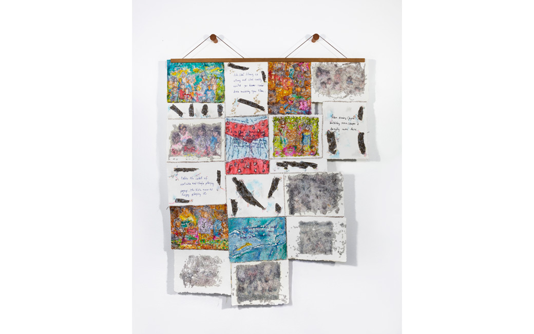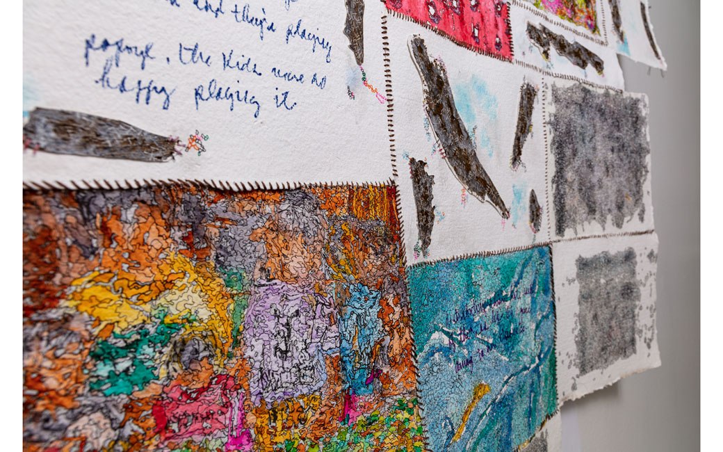 Ink, watercolor, marker, photo printed on transparency paper, digital collage, thread
