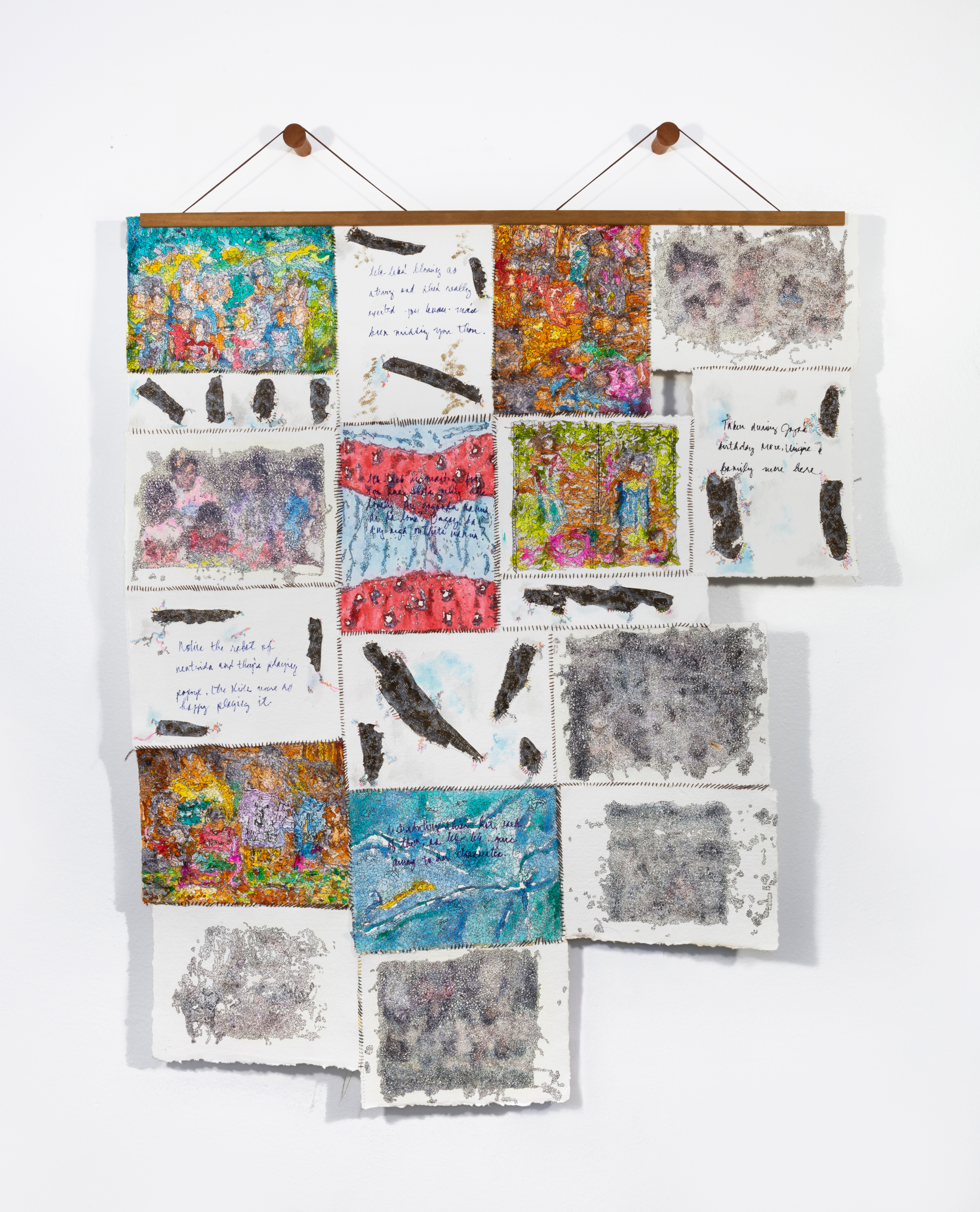 This piece is meant to communicate both a veneration of and contempt for relics. It incorporates a collage of the Santo Niño’s (Child Jesus’) regalia and other images associated with its worship. The Santo Niño is one of the most beloved Filipino cultural icons and the oldest Catholic relic in the Philippines, which was brought by Ferdinand Magellan. Photographs from my childhood are reproduced digitally or as painted abstractions that are cut then sewn into the piece. This piece also includes cut-out photos of my family members.