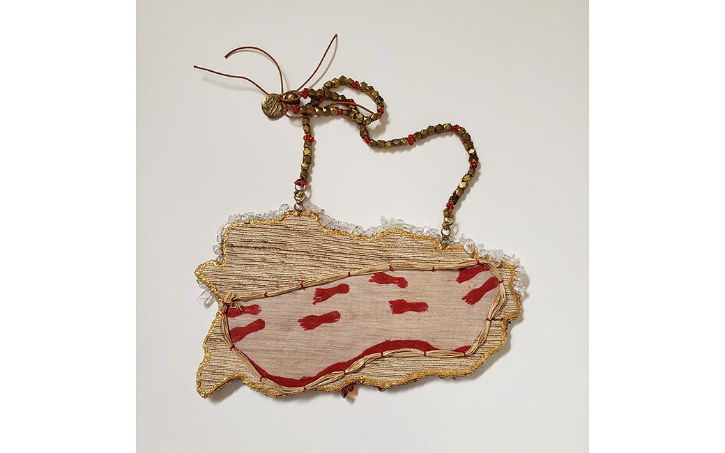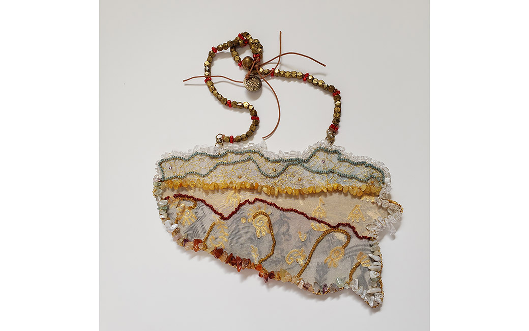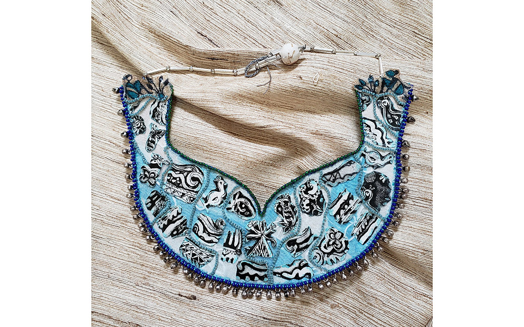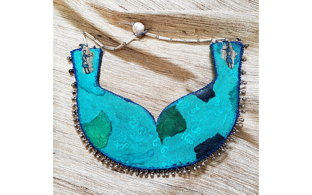 Migrants: Adapting in Vulnerable Landscapes: This necklace is dedicated to the people of Satabhaya, a village in the Mahanadi Delta, India. Deltas have a history of being vulnerable due to the rising sea levels and flooding. But, the devastation of the Satabhaya coastline in the Mahanadi Delta is like no other. The region’s villagers are India’s first “climate refugees.” I drew inspiration from the Odia film Kalira Atita (Yesterday’s Past), by Indian film producer/director Nila Madhab Panda, based on Satabhaya and the impact of climate change in this region.