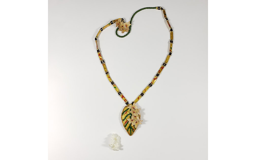 Cauvery Jasmine: I have dedicated this necklace to the women of the Cauvery Basin in Southern India who have also been impacted by the effects of the fast changing climate. These women have to make tough choices to sustain their families which not only affects them financially but also emotionally. This necklace symbolizes the gold ornaments, a “strongly gendered asset in the region,” only to be pawned for their sustenance. Inspired by Wells and well-being in South India, Divya, Susan Solomon and Nitya Rao.