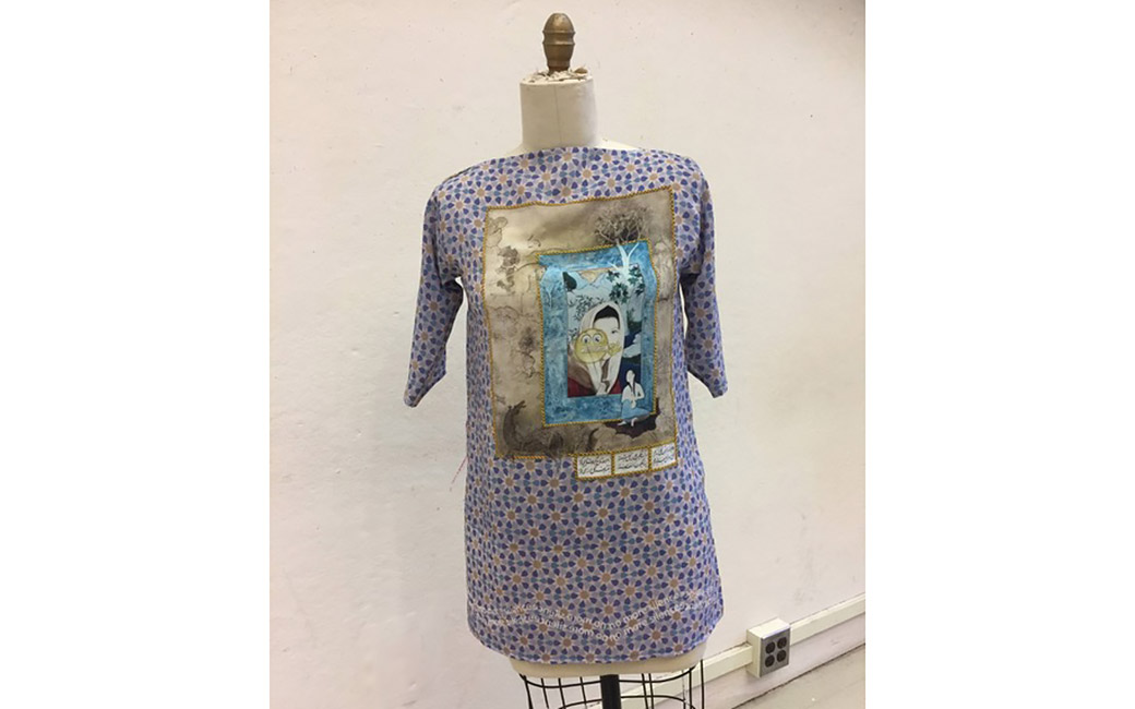 I made this while I was in fiber class at MICA. I printed an image of my artwork, The Reflection in the Mirror, on a fabric with a symmetrical geometric design to represent equality between men and women. The print depicts a scene from the Persian story Khosrow and Shirin. A prince on horseback gazes at Shirin while she bathes by moonlight as if she is nothing but an object. I painted Shirin as a self-portrait to show how gender inequities persist today. I also painted an emoji with the mouth zipped shut, because I don’t have a voice—despite new technologies that are supposed to make our lives so much easier. I created a border around the painting to create a safe space for the princess. A tree that is half inside the border symbolizes the power of women. At the bottom of this artwork is a horse. I wish to show that horse, like time, can go fast and women should get up and go with it. “Don’t be silent anymore, stand strong and make your life and your future however you want.” The poetry beneath the painting reads: “You are part of this world. Your roots show your originality. You are very strong.”