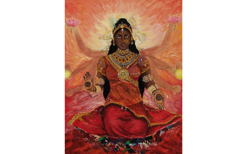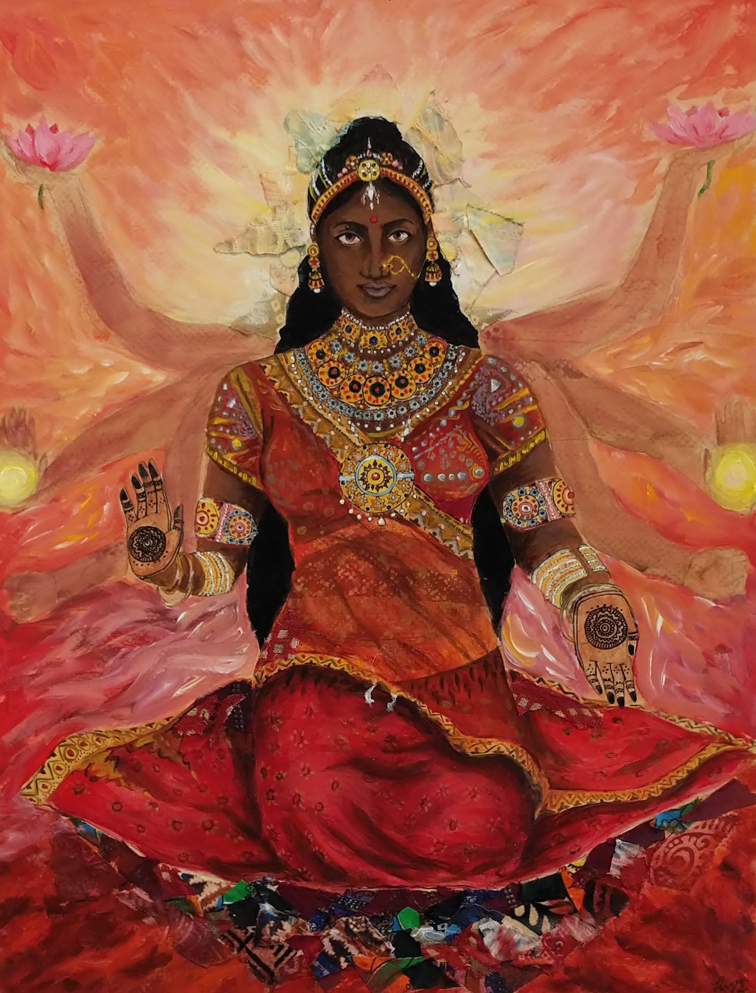 This painting is acrylic with collaged textile. It is a personal interpretation of the Hindu goddess Lakshmi to better represent the women I knew. Lakshmi represents wealth and success, and is almost always painted as a meek, light-skinned woman surrounded with gold coins. I believe that women can and should own their wealth and their beauty, so I presented her as a bold goddess, directly addressing the viewer. I painted her as a dark-skinned woman to reject colorism, which exists all over the world, as well as in India.