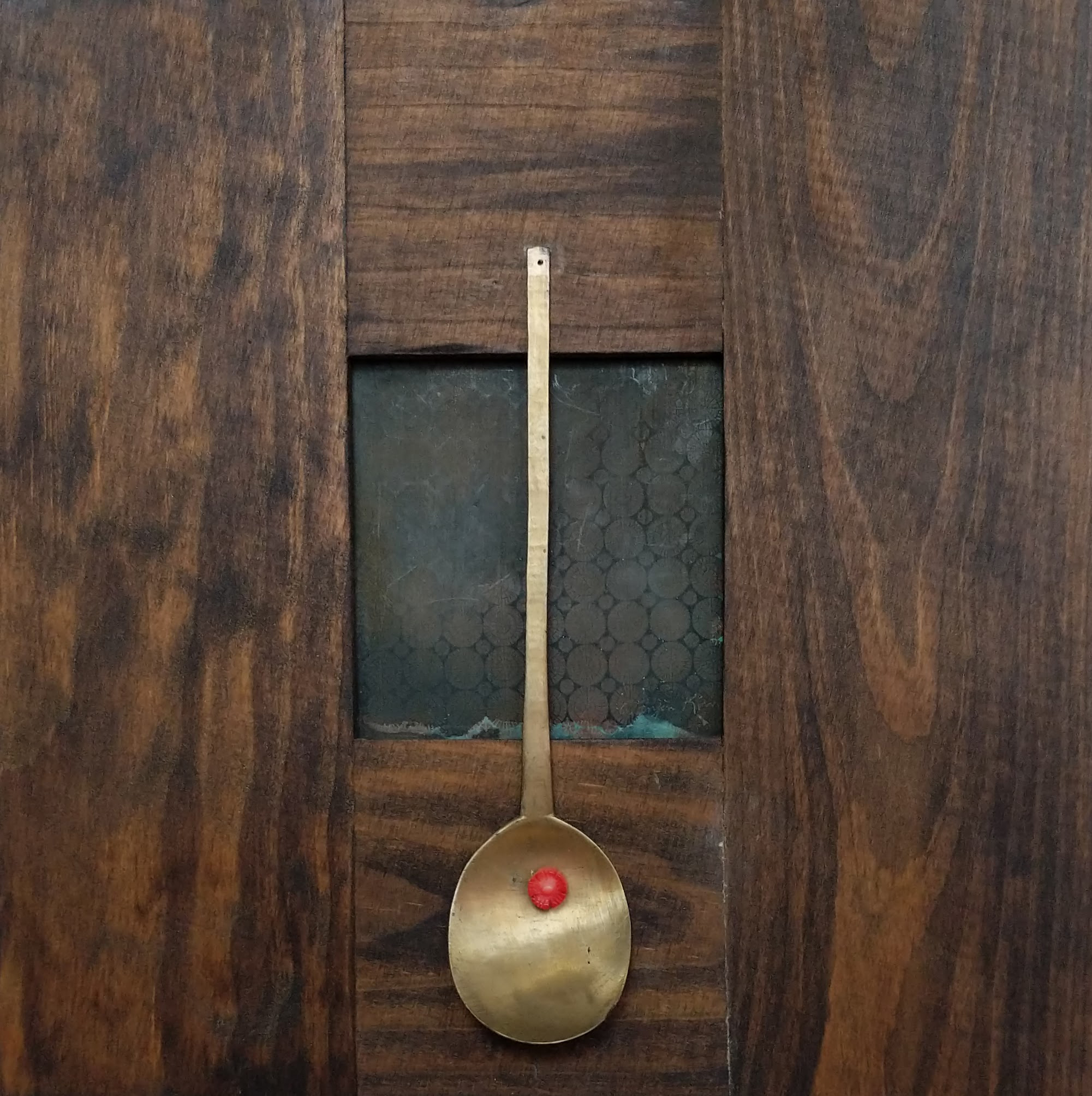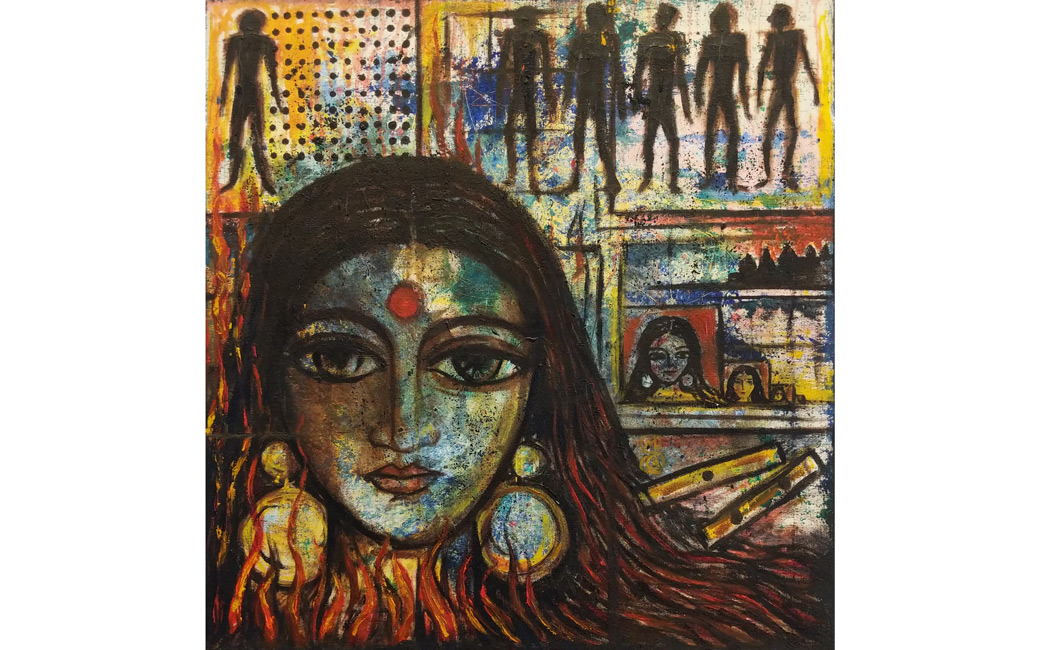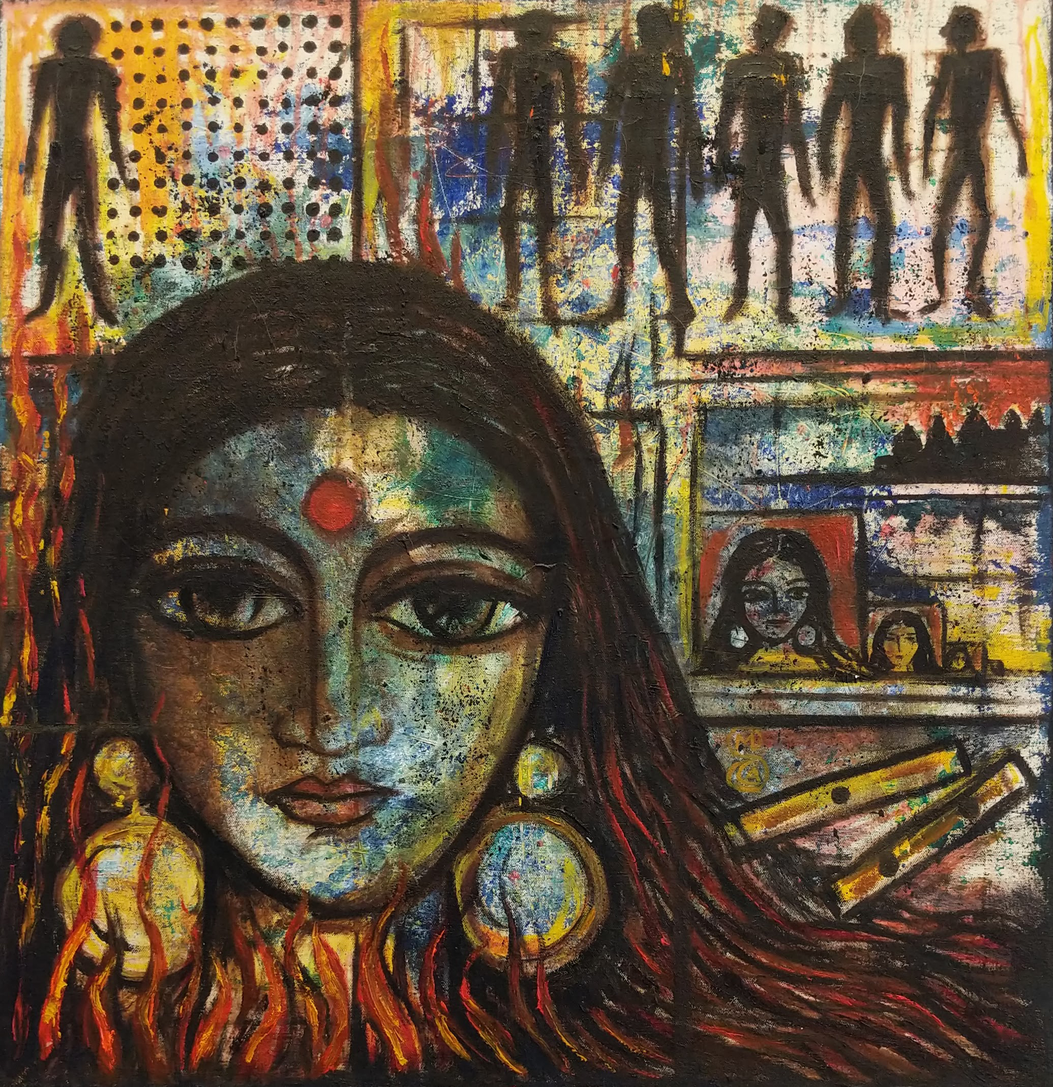 The word Shakthi means energy or the goddess of strength. This painting is part of a series about the collective female energy and about how different women face life and its ups and downs. Draupadi is the heroine of the Indian epic Mahabharatha, who was born out of fire and was known for her beauty, bravery and independence. In this painting, I have tried to depict her memories of the controversial life she led involving her five husbands and their cousins who went into war against each other after she was humiliated at a dice game.