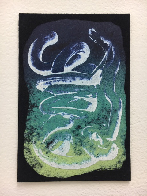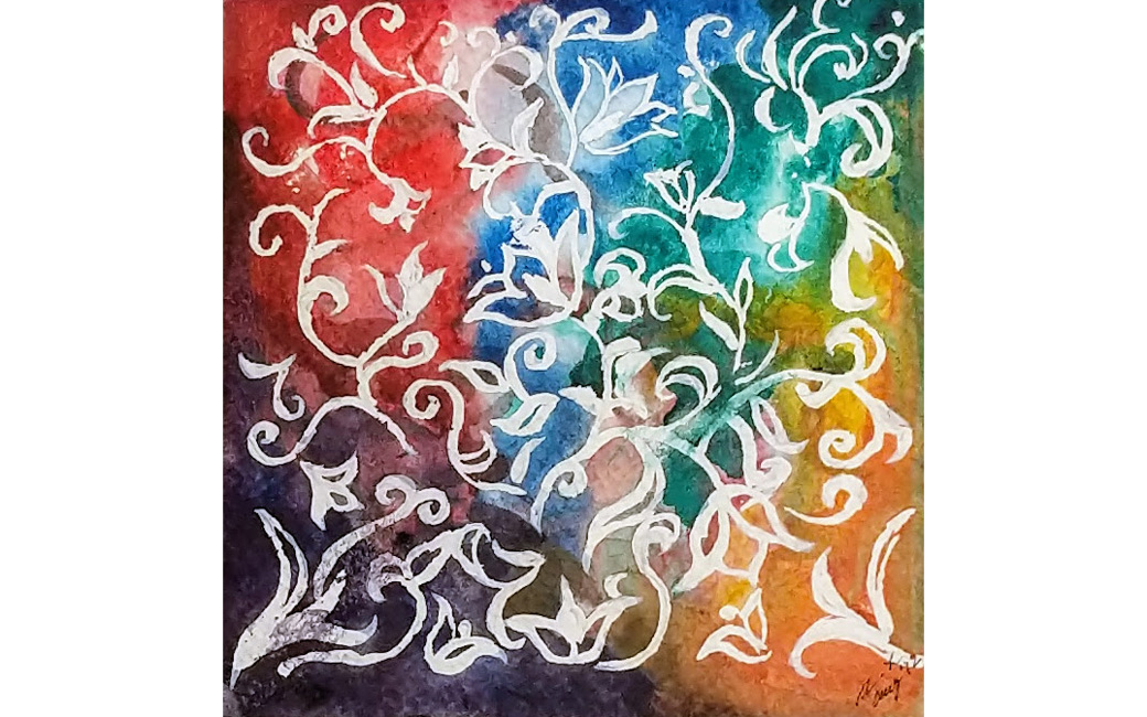 Starting off painting scenes of her childhood memory as a naïf painter, she has since developed a preference for abstracts with brilliant, happy colors technique and splashes that allow the viewer to interpret whatever they want to see.