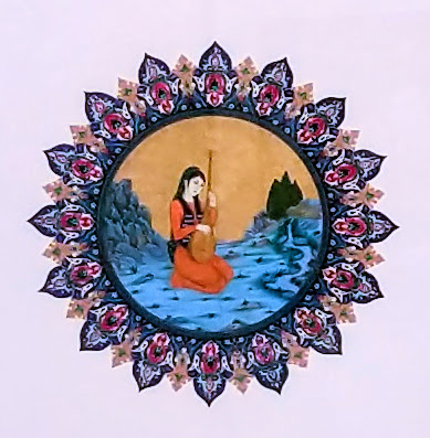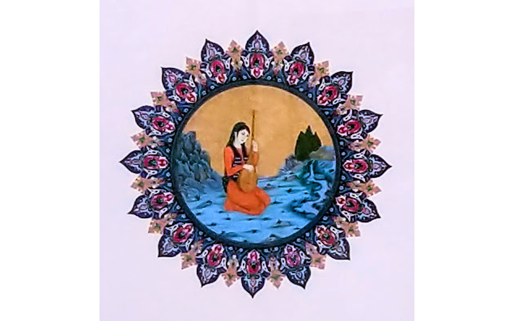 Hussainy painted this miniature while she was a student at Turquoise Mountain Institute, an art school in Kabul, the Afghan capital. She began with the shansa, the circular design, and then filled the interior with a lyrical scene in which a woman plays a tamboura while kneeling beside a stream. The woman is a quiet radical. Despite the tranquil air, she makes a bold statement, since women in Afghanistan typically are forbidden to play music.