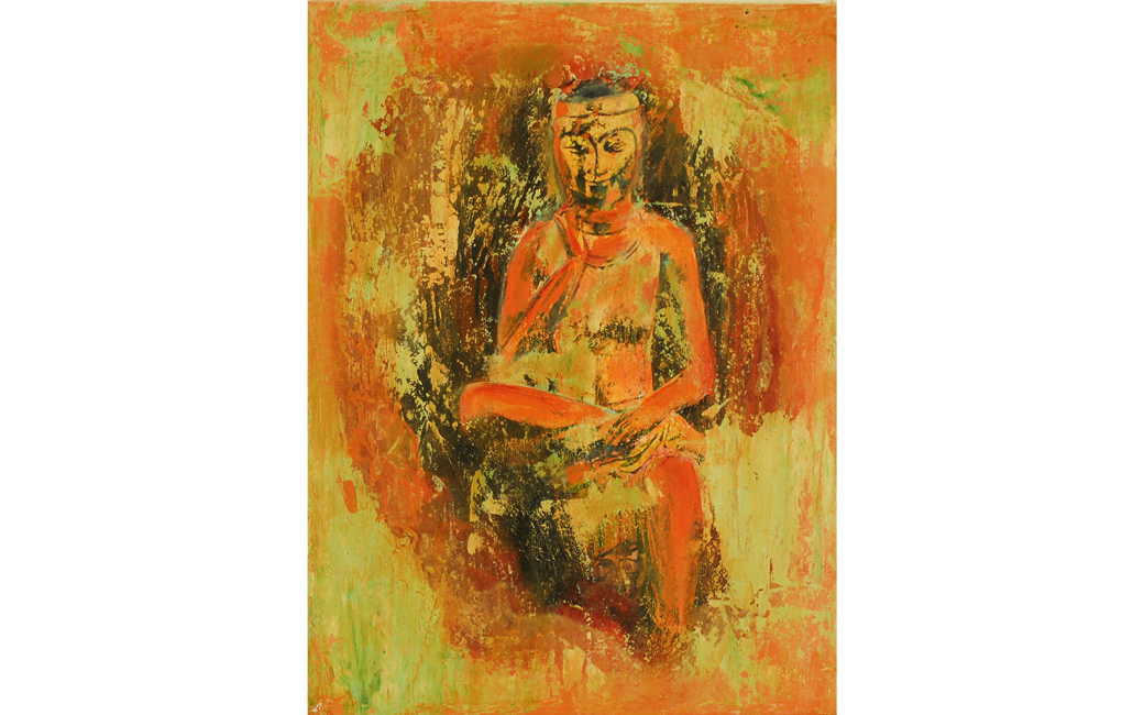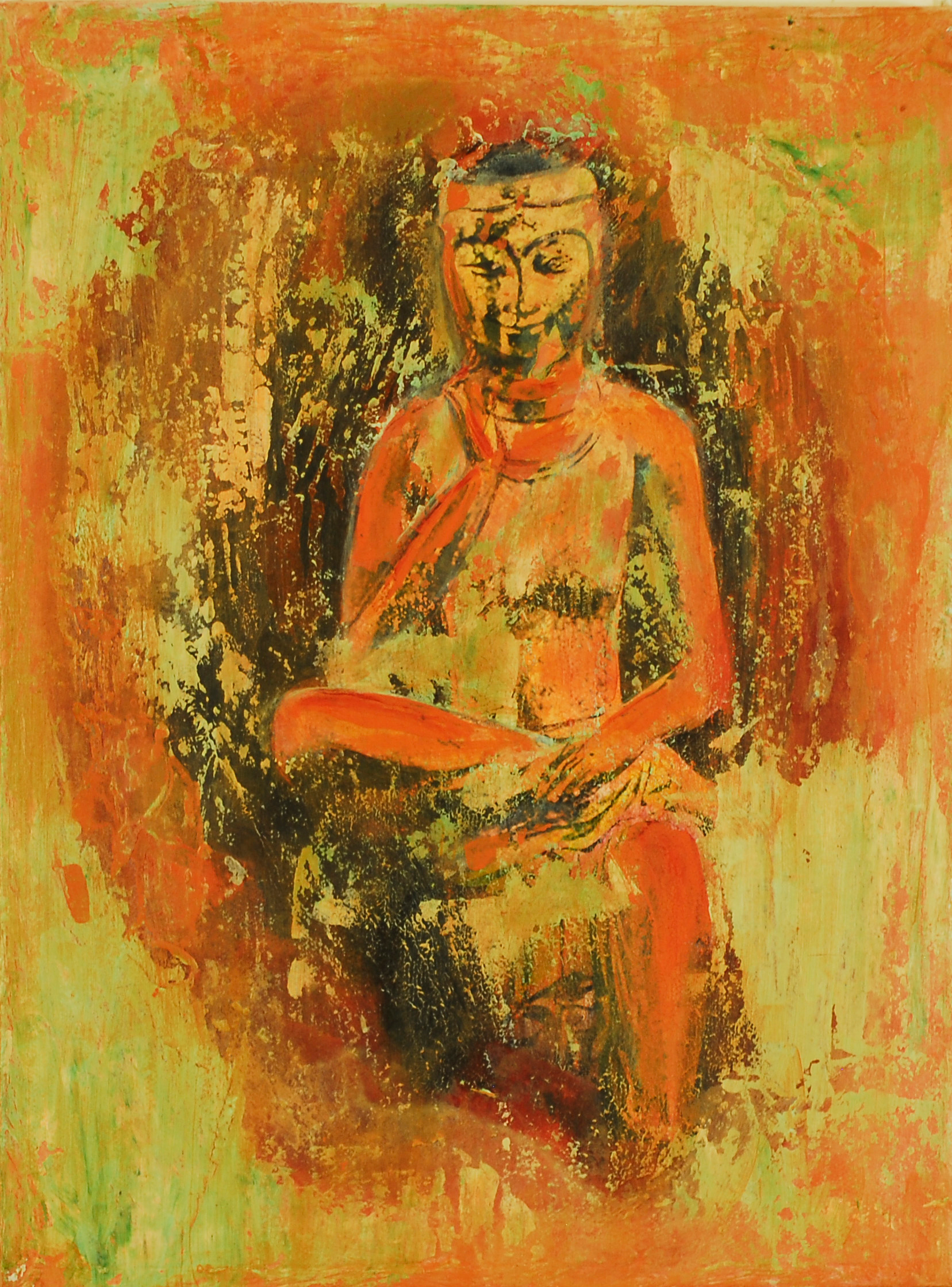In this work Korean-American artist, Kisook Lee-Suss, honors a sculpture that is found in the Korea National Treasures collection of a gilt-bronze statue of Maitreya Bodhisattva. It was created by an unknown artist in Korea. She has reproduced the image in this painting, offering her own interpretation of its original meaning: Maitreya: The Bodhisattva of the Future Buddha at the Hall of Maitreya Buddha. Maitreya (lit. "Loving One") was predicted by Sakyamuni Buddha to be the next Buddha on earth. In order to save all living beings who did not find salvation through the teachings of the Sakyamuni Buddha, he was designed to reign in the Tushita heaven and preach to heavenly beings until his incarnation, which, according to Buddhist belief, will occur 5670 million years after the Lord Buddha's demise. His hand seals are the “fulfilling-wishes mudra” and the “dispelling-fear mudra.” The sculpture’s strong sense of identity speaks to us down through the centuries, connecting old to new, in a kind of timeless fusion of past, present, and future. In Meditation the artist shares the treasure with the world-at-large. Her aim is to present an image that can be loved by all people, not just those who have visited the museum. In so doing she explores how Korean spiritual culture interrelates with all similar cultures worldwide. Its pleasing message voicelessly educates and teaches hope and comfort to humanity.