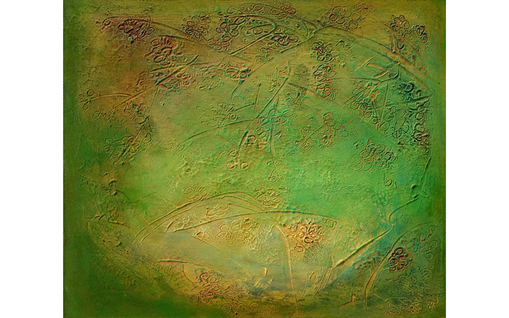 My work is an experiment with transferring traditional East Asian art forms onto the Western canvas. I have innovatively adapted the Asian themes of nature, earth, heaven, flowers, and ancient Chinese characters. The abstract images and forms embody complex layers of the spiritual and emotional. The rough surface enhances visual depth and life. I want to express the living energy that Korean artists try to capture onto a one dimensional surface. These paintings exemplify the juxtaposition of East and West. Fused together are the philosophies of the East with the media techniques of the West. One of the most important elements in East Asian art is the line. My painting echoes and emphasizes the calligraphic line. This is a continuous living line made with one stroke.