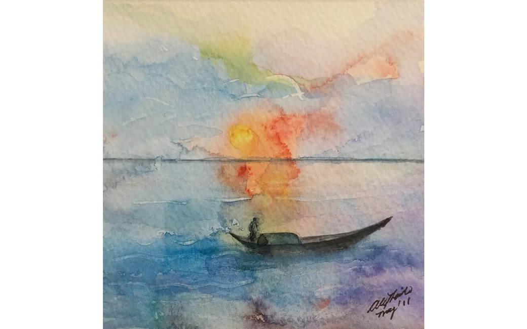 I was born and brought up in Bangladesh, the land of rivers and vibrant nature. I am a watercolorist and a sitar player, experiencing the flow of life in both my mediums of expressions. Each set of watercolors, in this collection, depicts the journey of inspiration from my origin (Bangladesh), to the universality of my transformation in expression of the core feeling: ‘Humanity is deeply bonded with resonance of nature’.