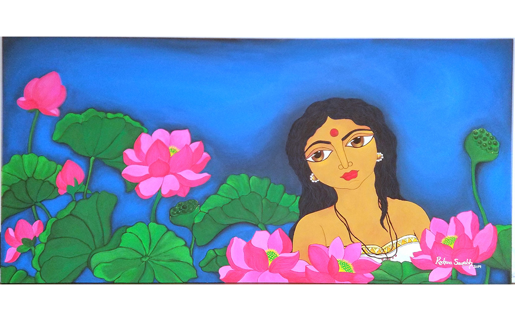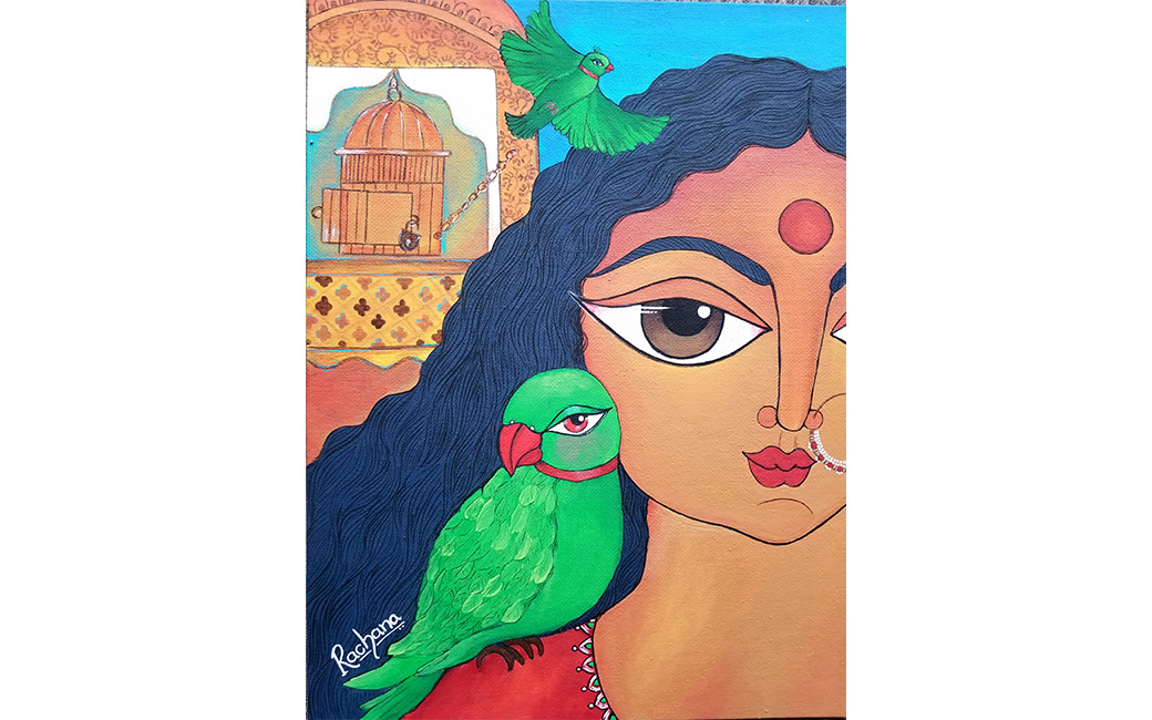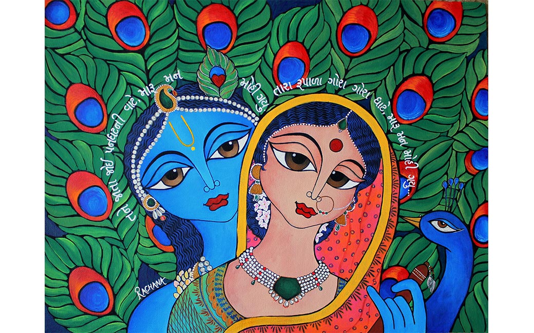 In my artwork, women express their feelings through their big, bold eyes. For me, it is sheer joy to portray the female form, and the Indian woman, with all her splendor, has so many stories to tell. “Lavanya” means “grace” or “beauty.” Her eyes have their own vocabulary; how she feels inside is reflected in her eyes. In She got wings (2020), the woman, bound with responsibilities and forgetting her own dreams and identity, realizes she has her own wings. Her eyes say that now there are no boundaries to stop her. The Radha - Krishna love story is legendary. Radha feels jealous of all the other gopis of Vrindavan to whom Krishna pays attention. But Krishna tells her: “Radhe, do you not know that you are the love of my life? My flute only vibrates to your sweet name. No other sound comes out from my flute. Only, Radhe, Radhe . . .”