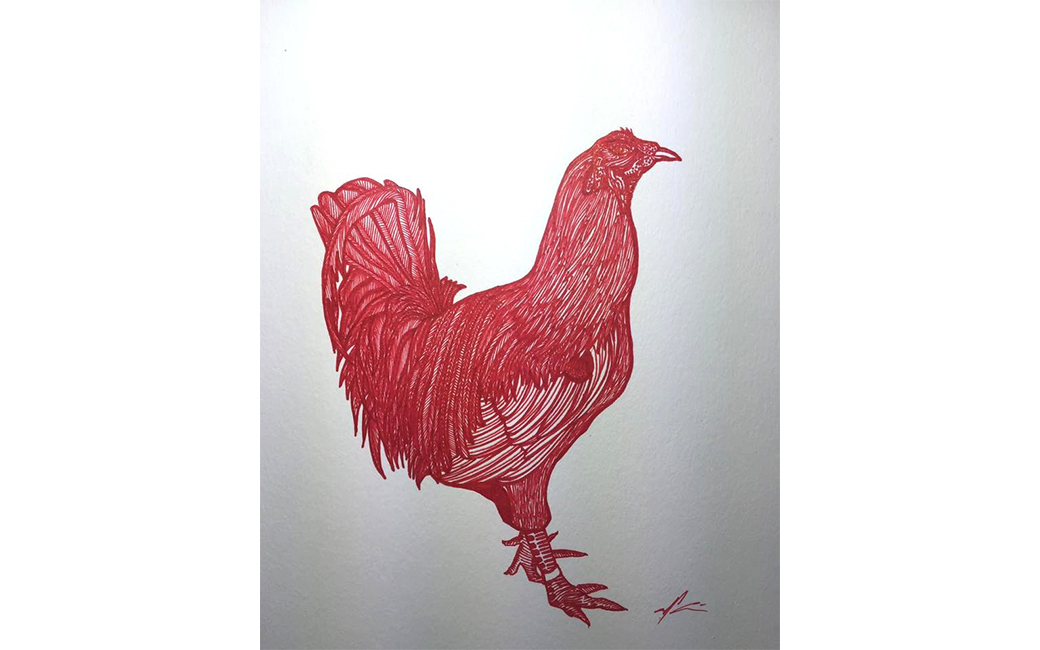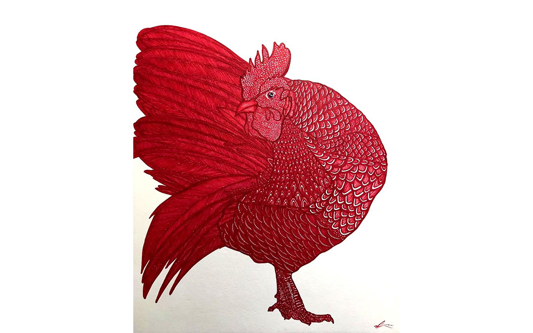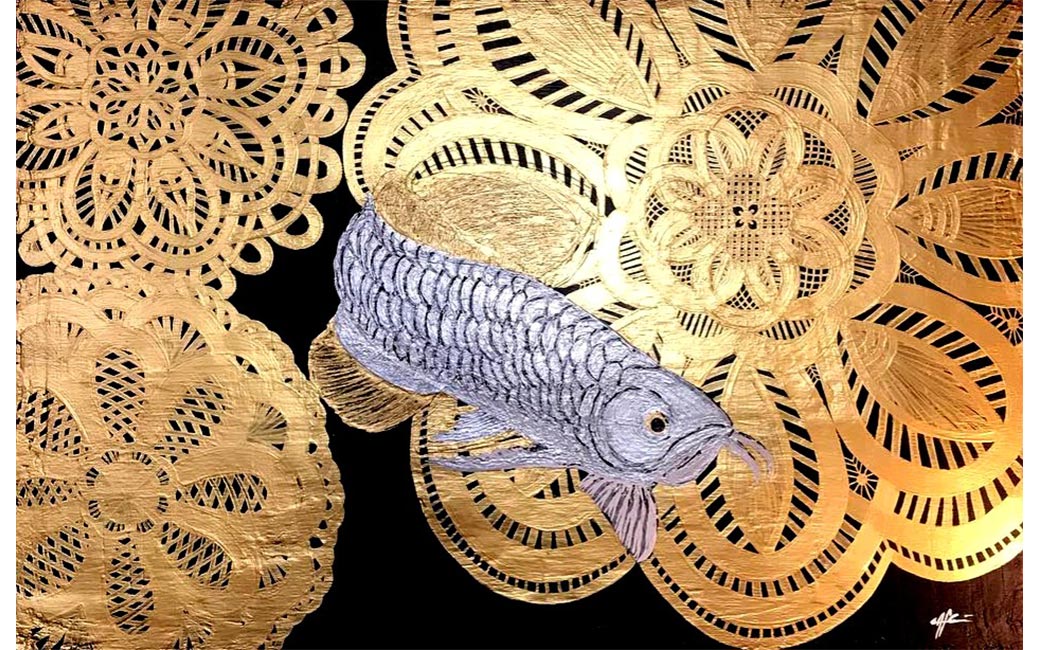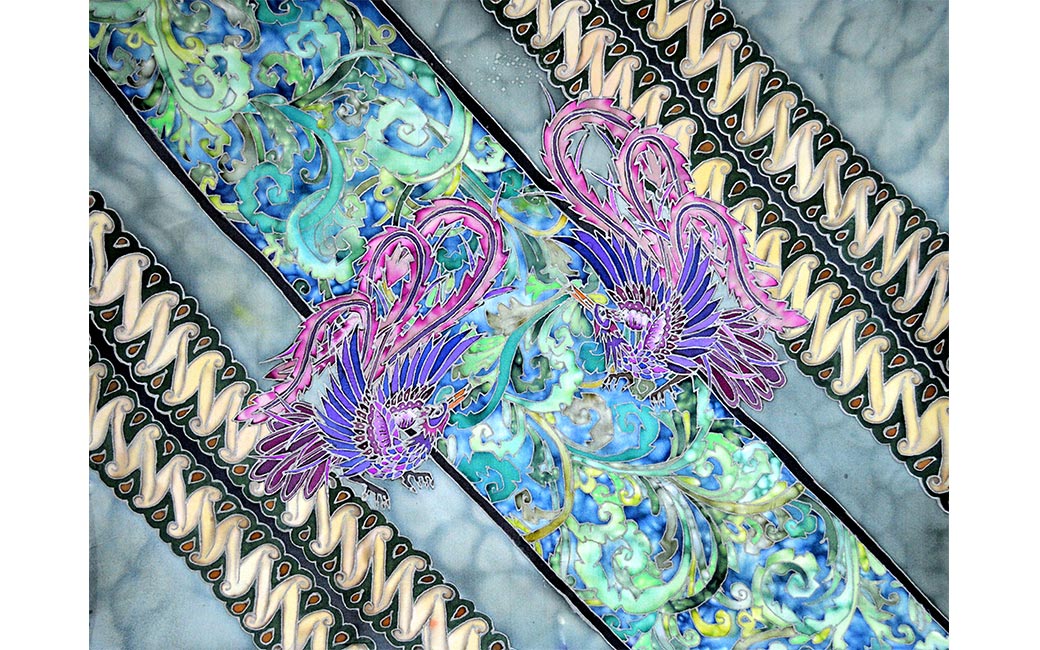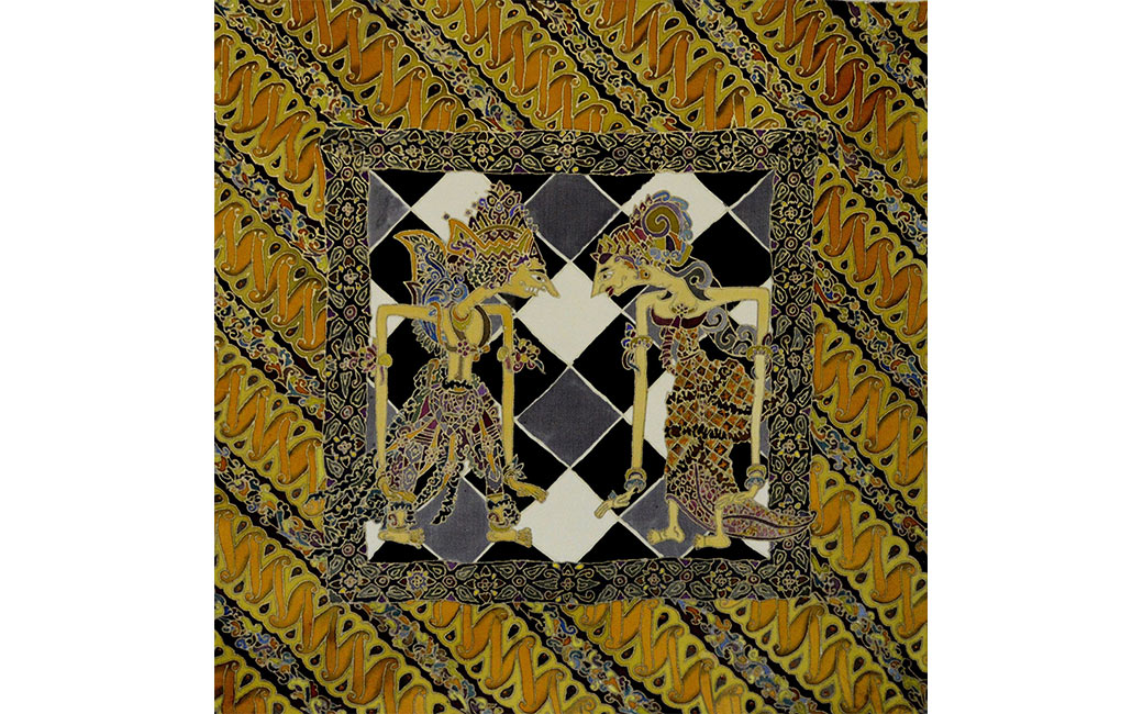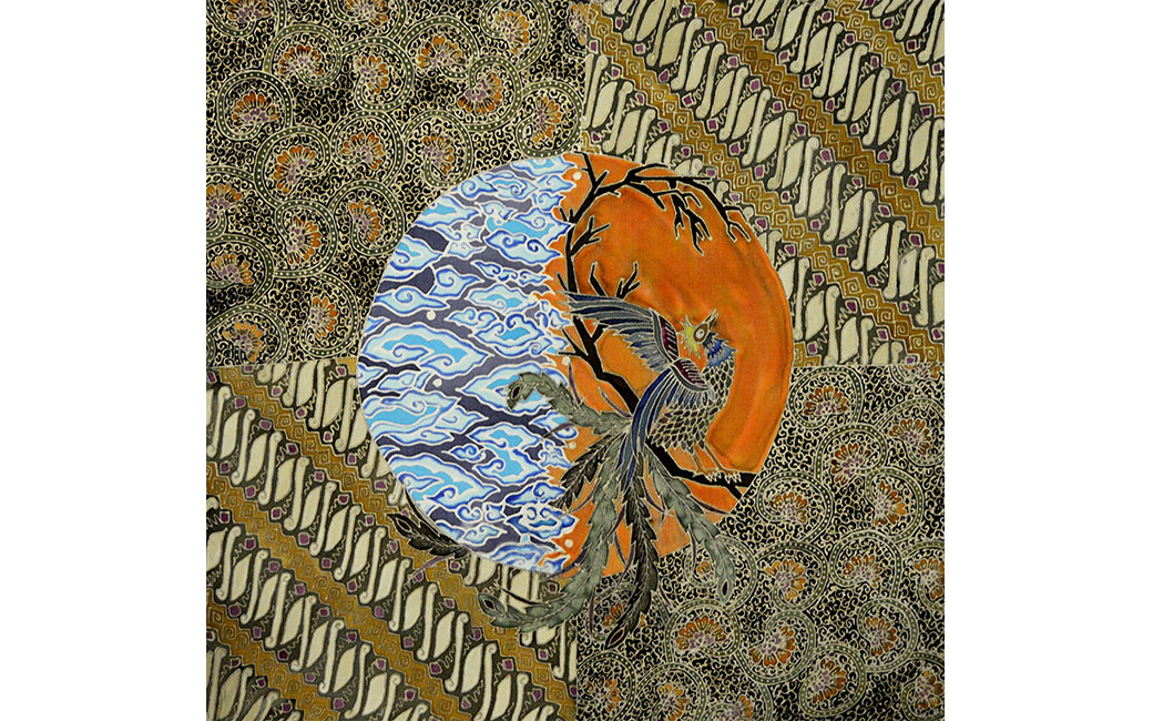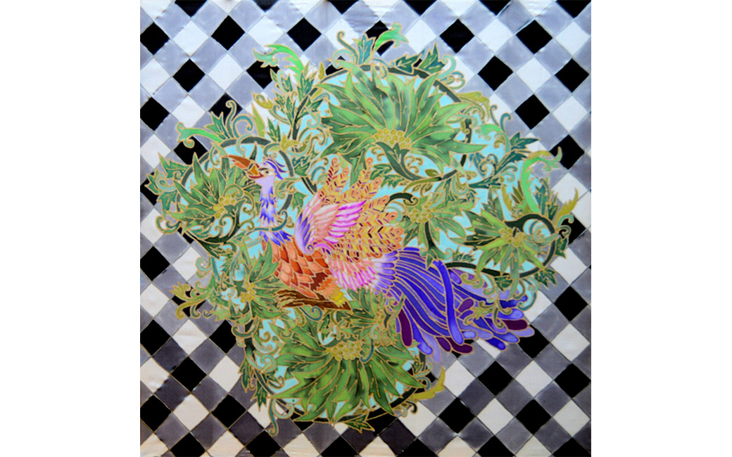 Nico Gozal’s cross-cultural art training includes the Budihardjo School of Fashion in Jakarta, Indonesia as well as the International Academy of Merchandising and Design in Tampa, Florida. Gozal draws his inspiration from elements of Central Java and Balinese traditional art and culture, including Javanese Wayang/shadow puppets, Javanese Batik motifs, and Balinese wood carving design. He hopes to bring a modern twist to Javanese and Balinese culture and introduce them to the rest of the world. Four of Gozal’s works are on view here. The Rooster Dance (2018) is inspired by Tajen, an old cock fighting culture in Bali which has been banned for its cruel practice. Batik Parang Rama & Sinta (2017) features the two main characters from the Wayang/shadow puppet tale of Ramayana. Batik Rumpi Sari (2017) depicts various elements of Javanese batik motifs, including the famous “Mega Mendung” design from the Cirebon region. The black and white checkered cloth (Saput Poleng) featured in Zambrud Khatulistiwa (2019), is commonly found wrapped around trees, statues and other elements of worship in Bali. It represents the presence of good and evil and everything in between (Rwa Bhineda).