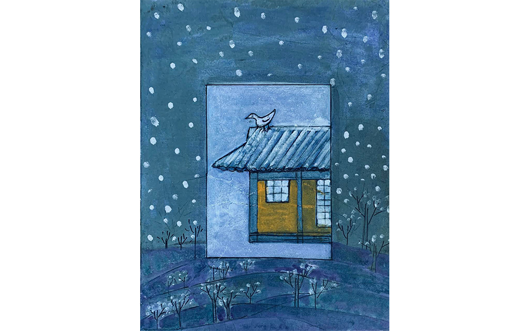 Two of Grace Sunsook Park’s works are on view here. “Sungmu” or monk’s dance is a unique Korean cultural treasure and inspired her art. Gracefully flowing movements and meditative stillness define the aesthetic of a typical performance. The origins of this beautiful dance can be traced back 500 years to Buddhist ceremonies as an offering to Buddha. While the dance began as a Buddhist offering, it has evolved beyond religious ideals to a deeply artistic expression of the universal emotions of suffering, hardship, resilience, nirvana, and joy. In Harmony (2020), Park strives to capture the stark simplicity of the solo dancer’s flowing white robe, long sleeves and white hood. The simplified landscape in Peace (2018) is a metaphor for Park's journey. It reflects the journey into a fantasy world filled with imagination and wonder.