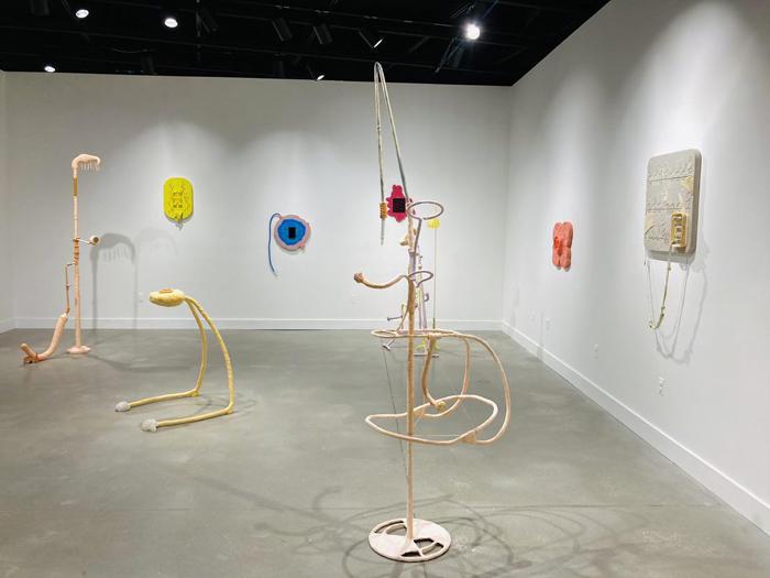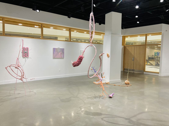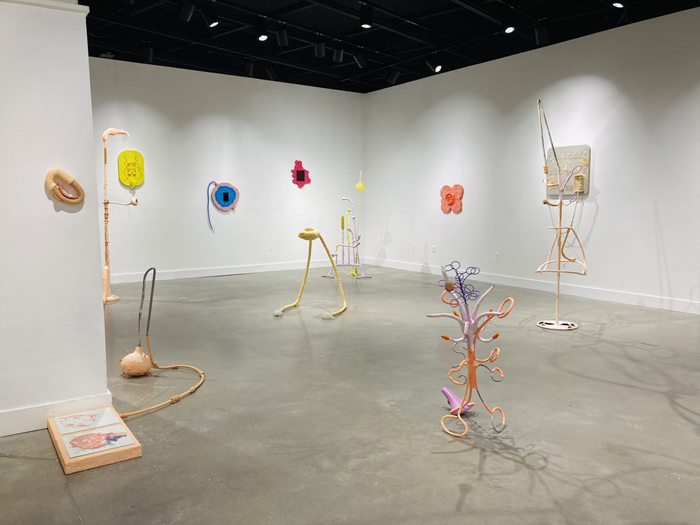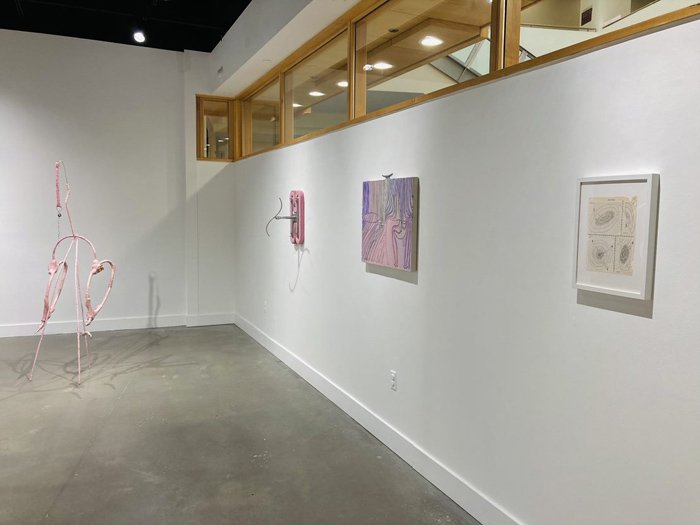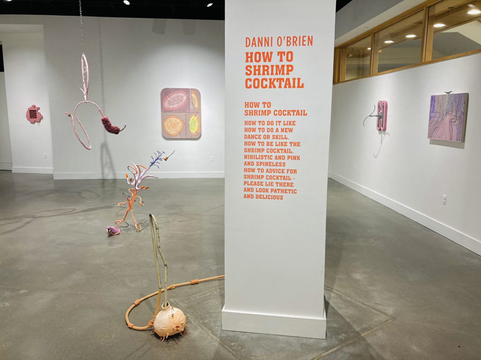O’Brien examines perceptions of gender, domesticity, craft and conspicuous consumption. O’Brien states: “My interdisciplinary art practice is rooted in anti-capitalism, haphazard play and owned queerness.” She creates what she describes as “precarious” assemblage sculptures. Her process includes “collecting, organizing, tinkering, festering and re-skinning.” She states that she concocts haphazardly, shoving materials into others, dangling them from each other, and forcing the components to rely only on each other. As a result, the work is inherently unstable, generating physical and conceptual precarity. This exhibition also includes drawings and wall-based relief sculptures responding to a collection of found diagrams and images sourced from outdated science texts, how to manuals, and DIY books. She isolates from what she describes as “beautifully complex and educational diagrams, removing them from context, and distorting and abstracting them.” Her sculptures, made up of small parts joined together, reference the body through pink, organic shapes and what seem to be limbs, their pulpy textures referencing flesh or organs. There is a simultaneously tragic and wonderfully awkward quality to these figures.