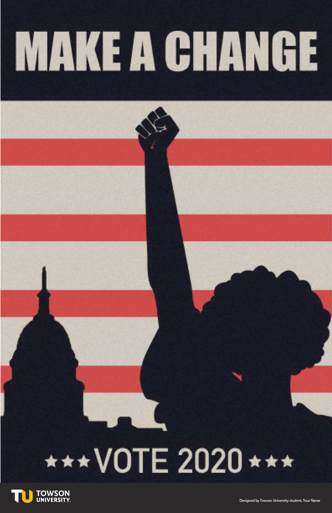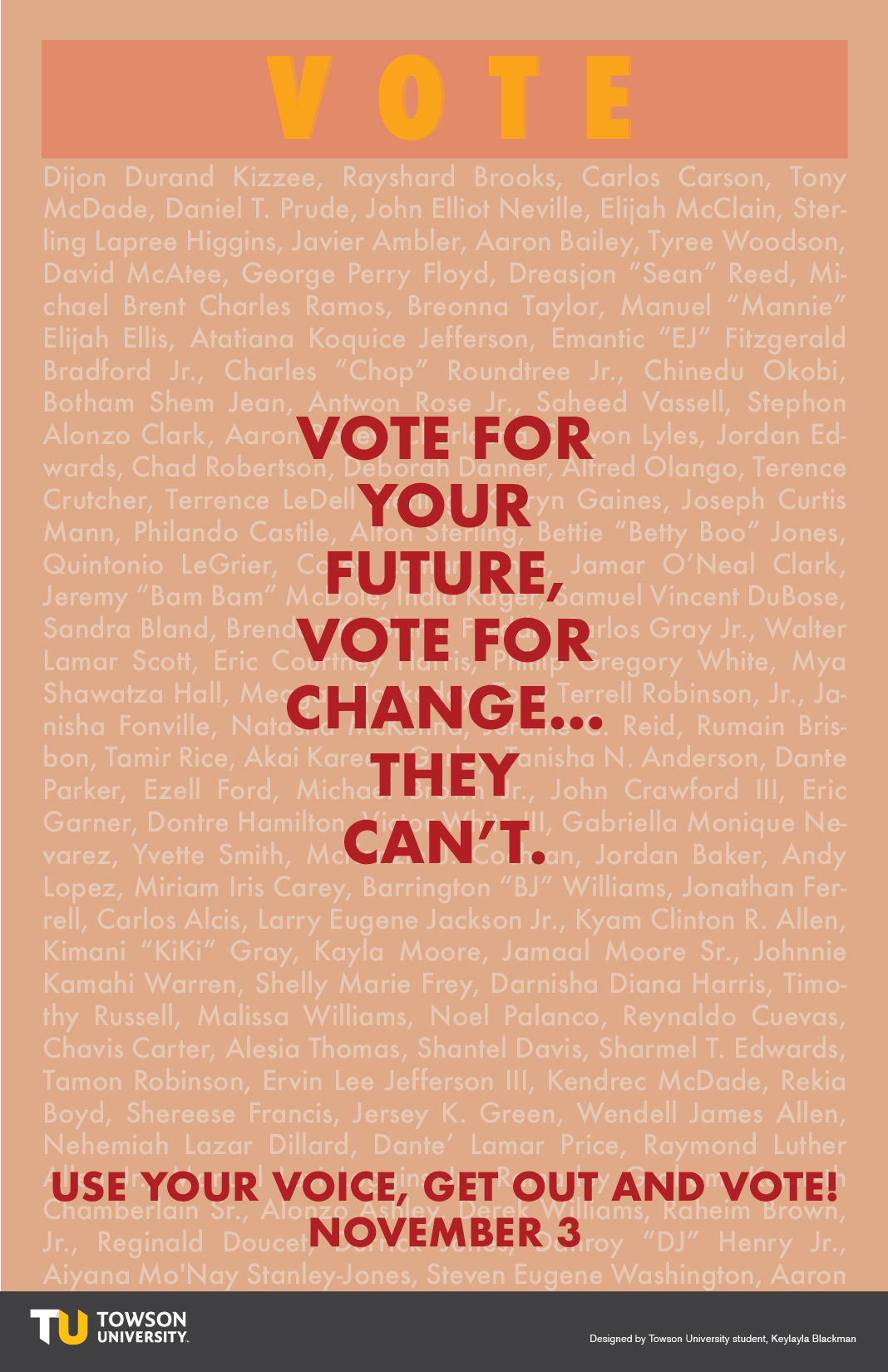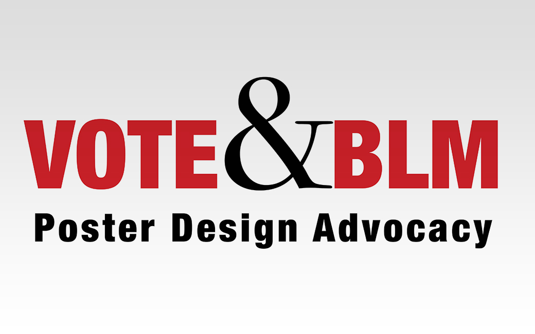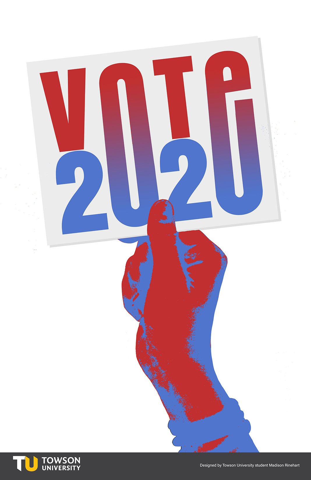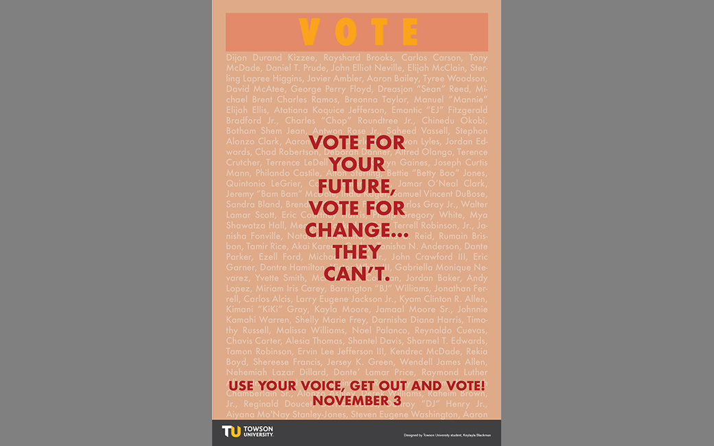 This fall, Towson University graphic design students are actively engaged in design citizenship; researching issues, listening, holding dialogue, and designing posters supporting the Black Lives Matter movement and voting in the 2020 election. Through the unique visual impact of posters, this exhibition seeks to inform, advocate, and call people to action.