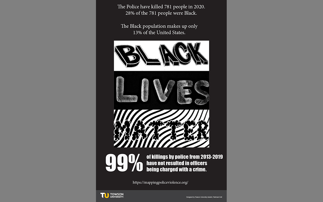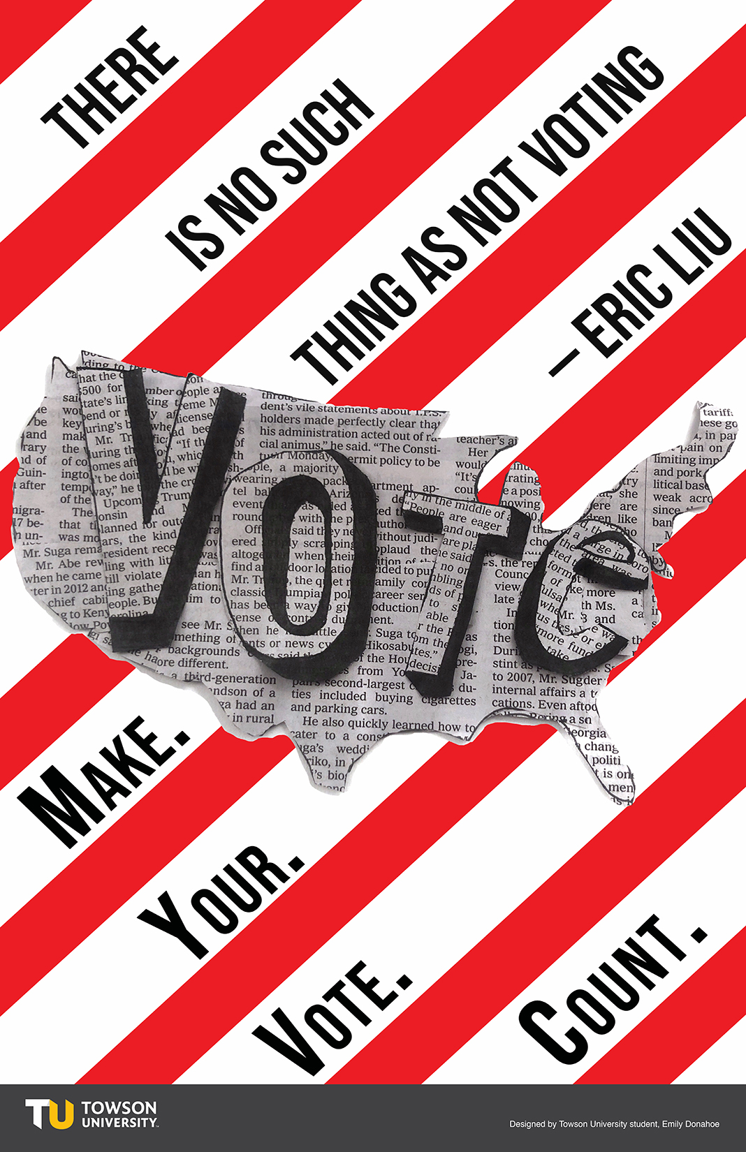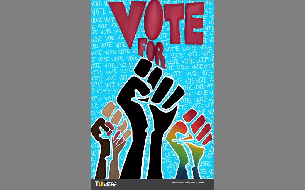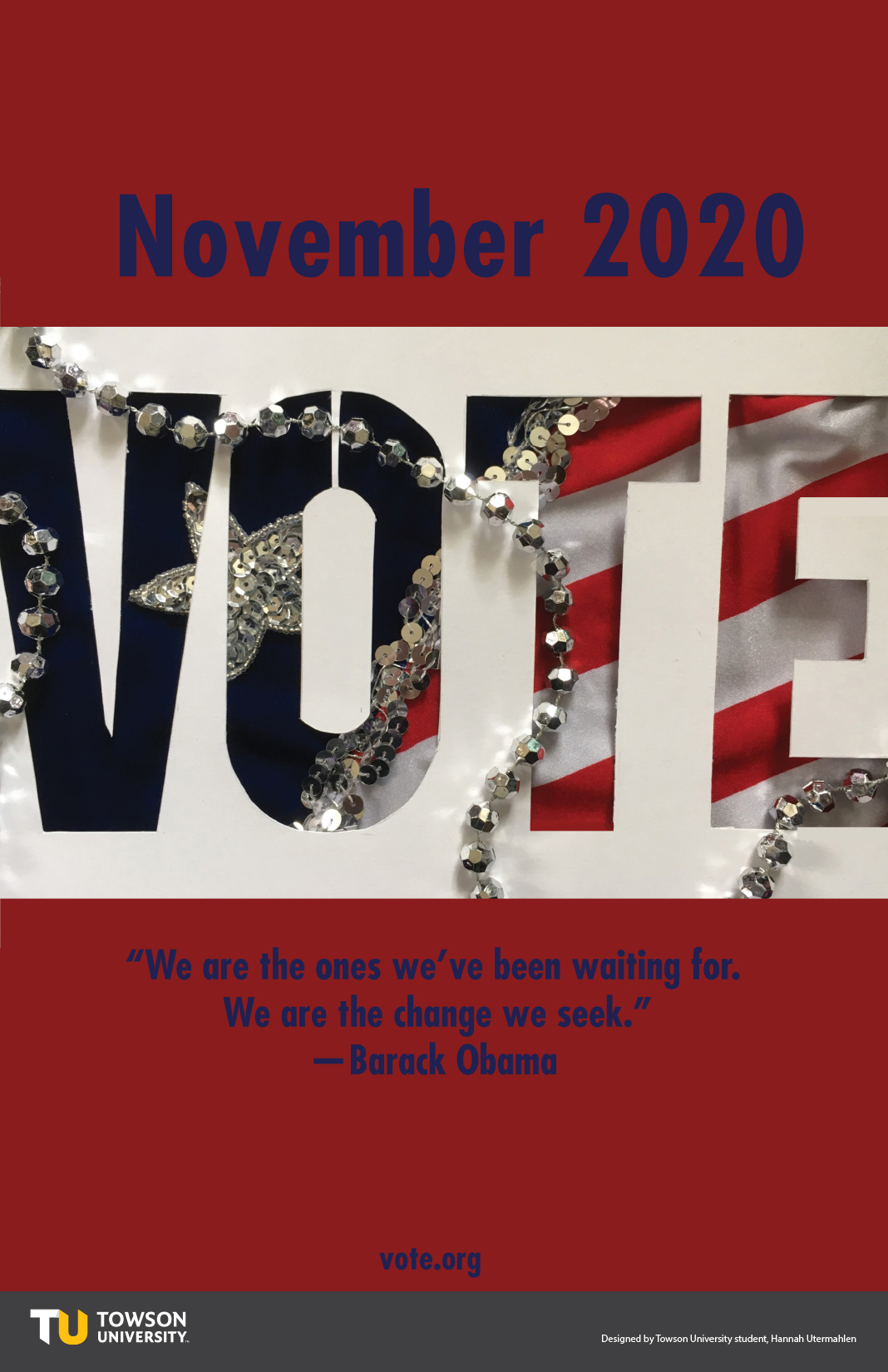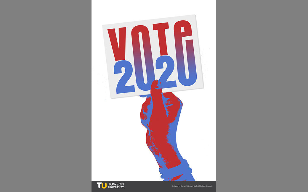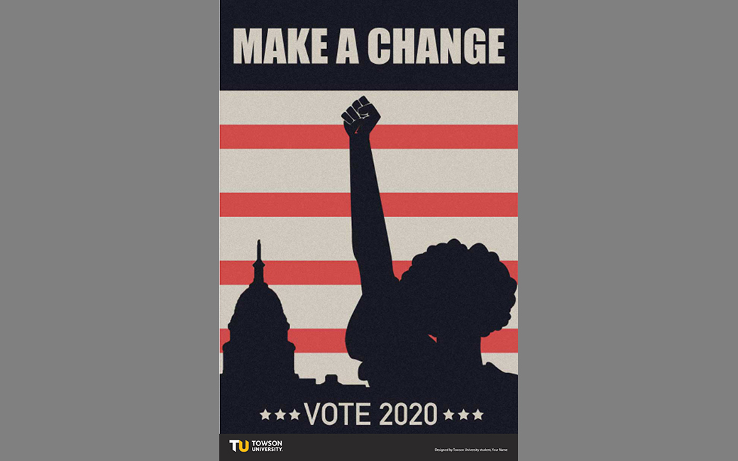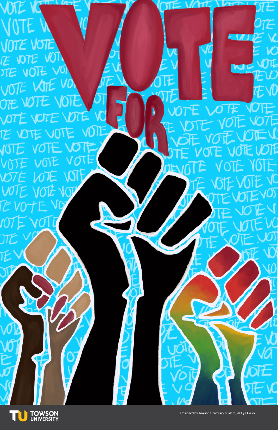 This fall, Towson University graphic design students are actively engaged in design citizenship; researching issues, listening, holding dialogue, and designing posters supporting the Black Lives Matter movement and voting in the 2020 election. Through the unique visual impact of posters, this exhibition seeks to inform, advocate, and call people to action.