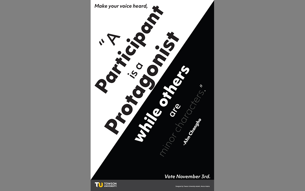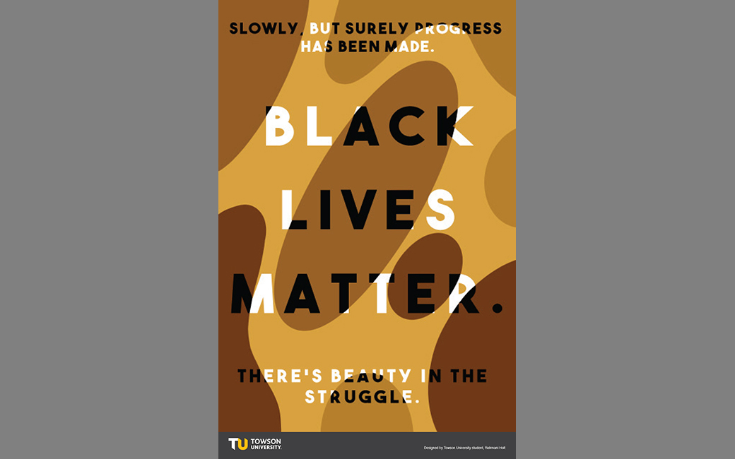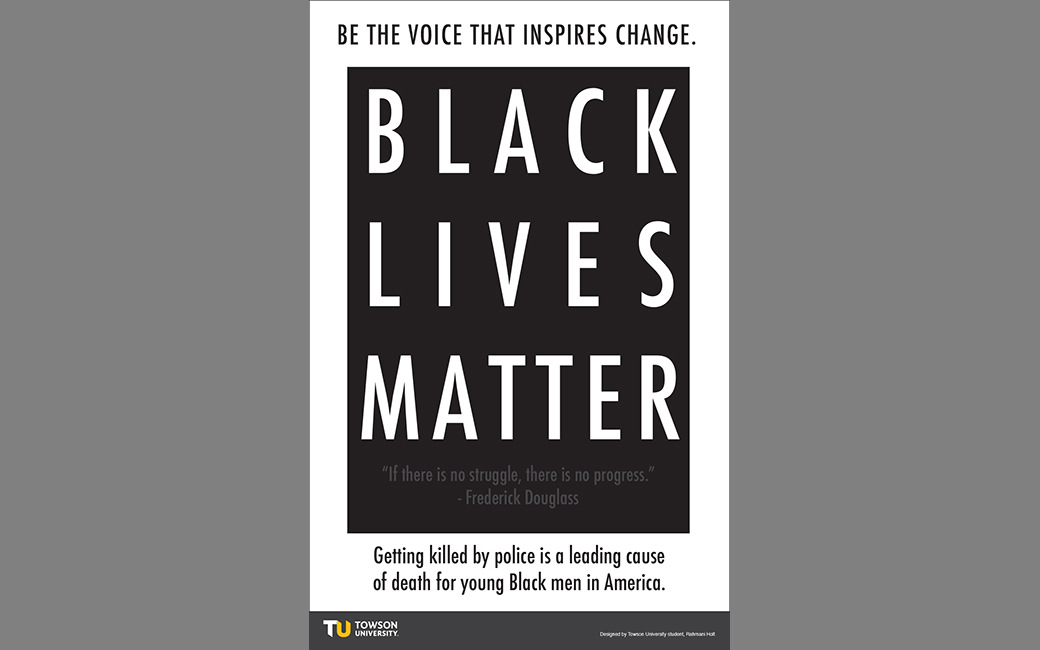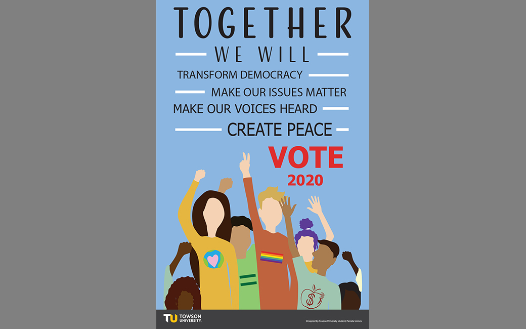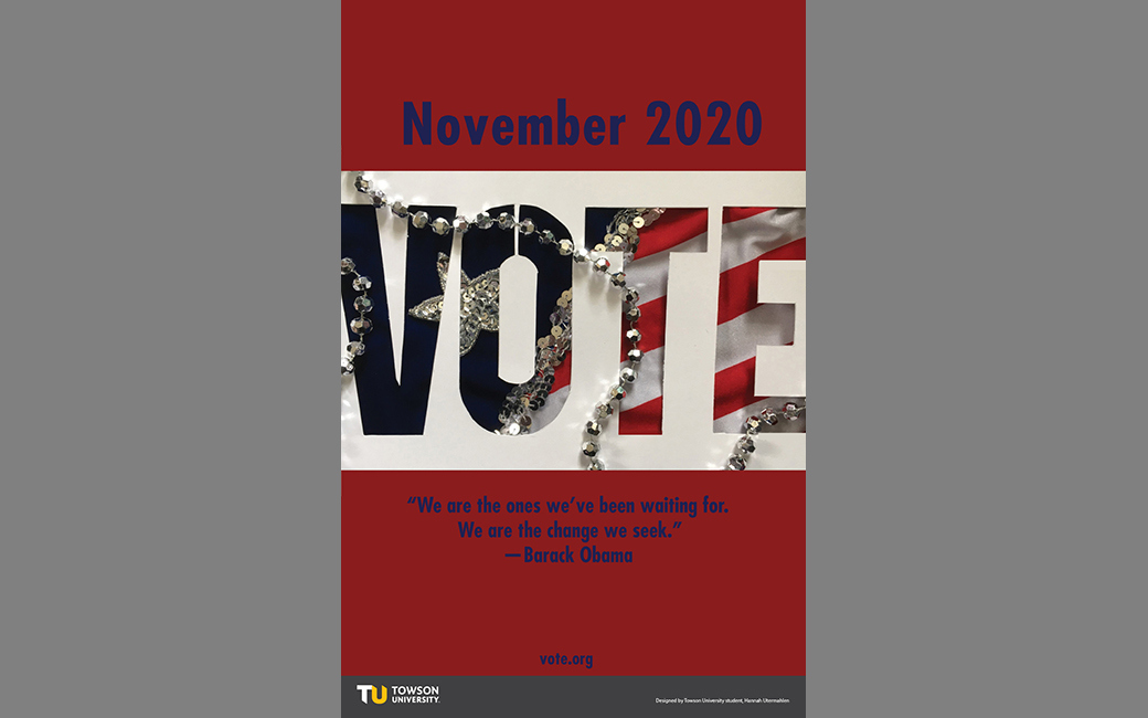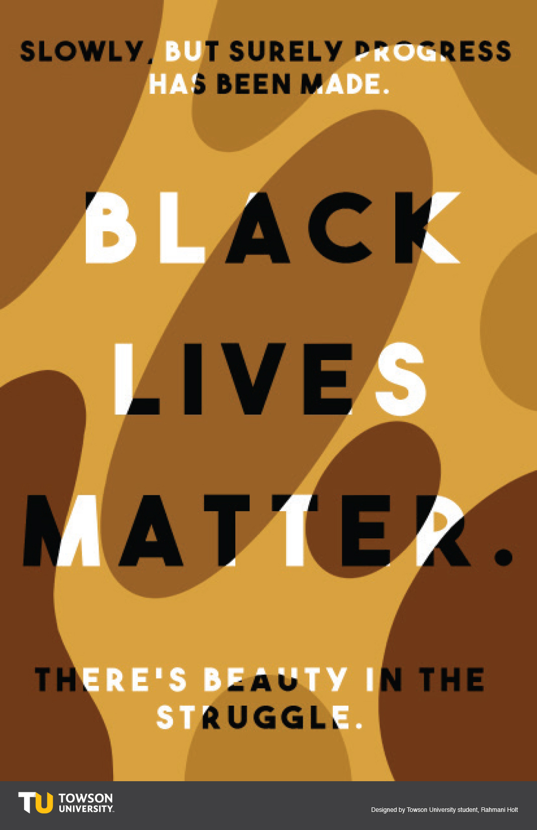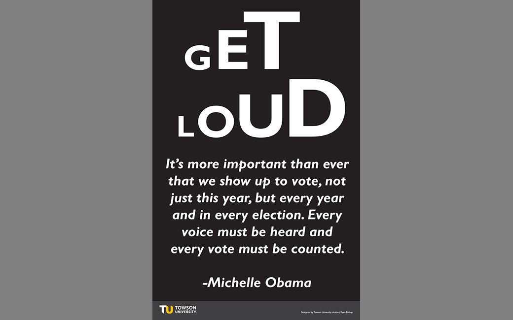 This fall, Towson University graphic design students are actively engaged in design citizenship; researching issues, listening, holding dialogue, and designing posters supporting the Black Lives Matter movement and voting in the 2020 election. Through the unique visual impact of posters, this exhibition seeks to inform, advocate, and call people to action.