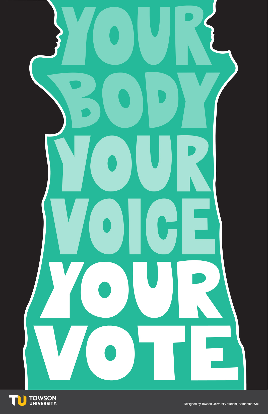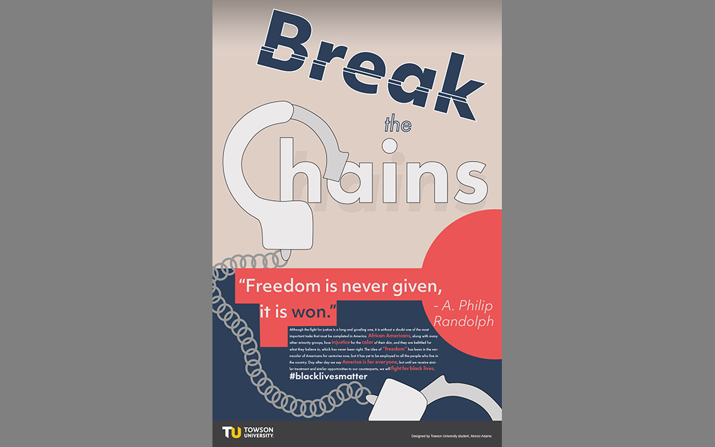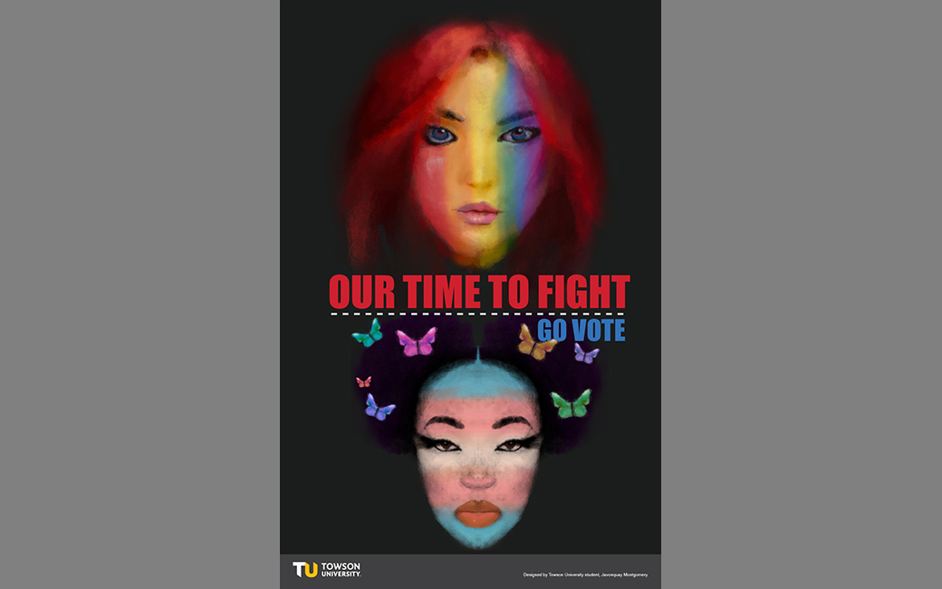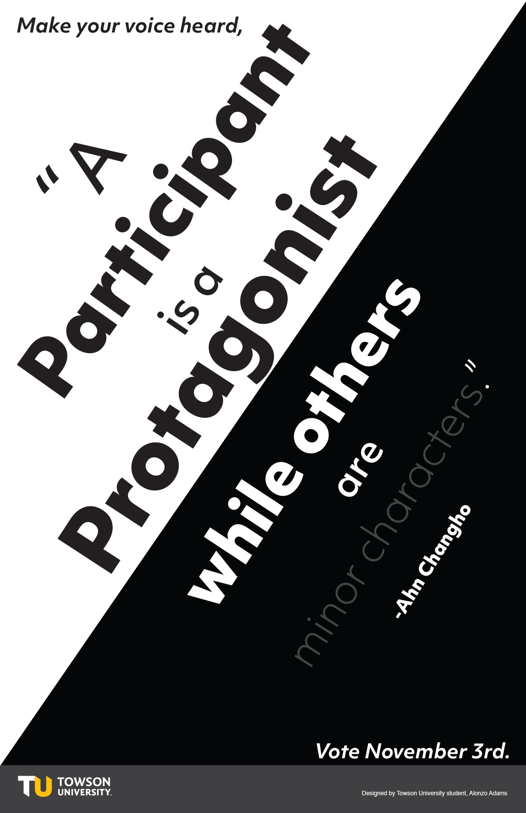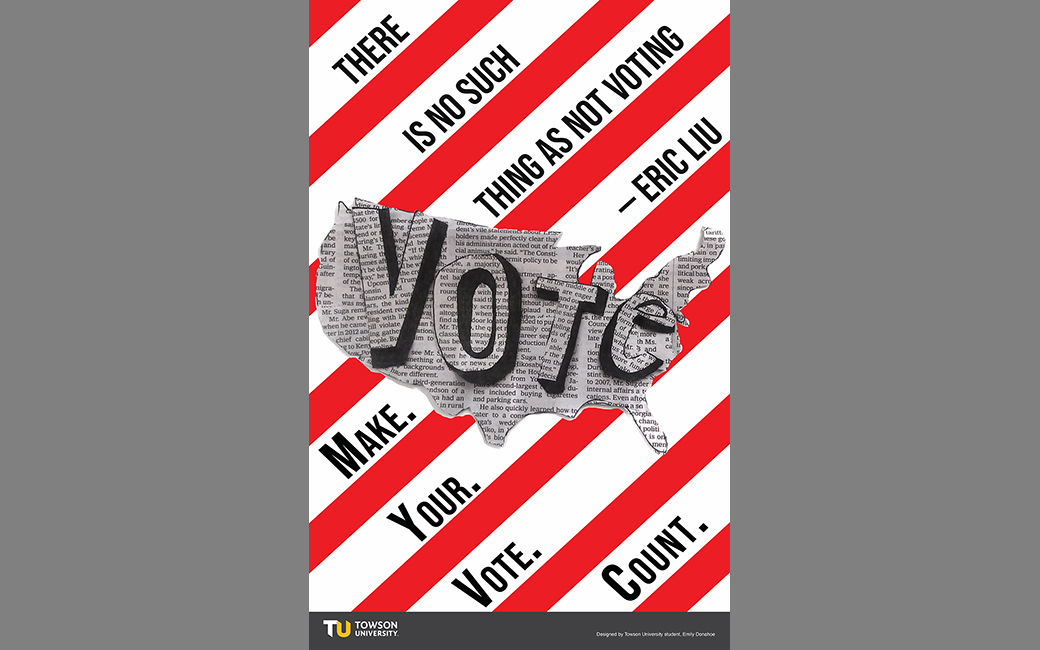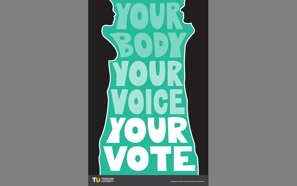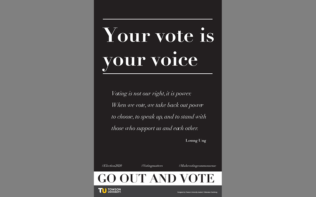 This fall, Towson University graphic design students are actively engaged in design citizenship; researching issues, listening, holding dialogue, and designing posters supporting the Black Lives Matter movement and voting in the 2020 election. Through the unique visual impact of posters, this exhibition seeks to inform, advocate, and call people to action.