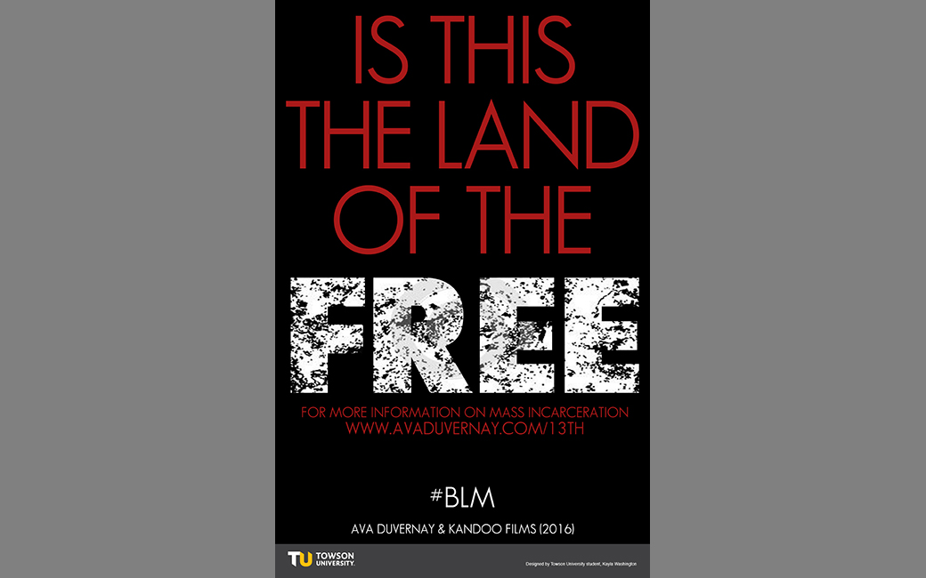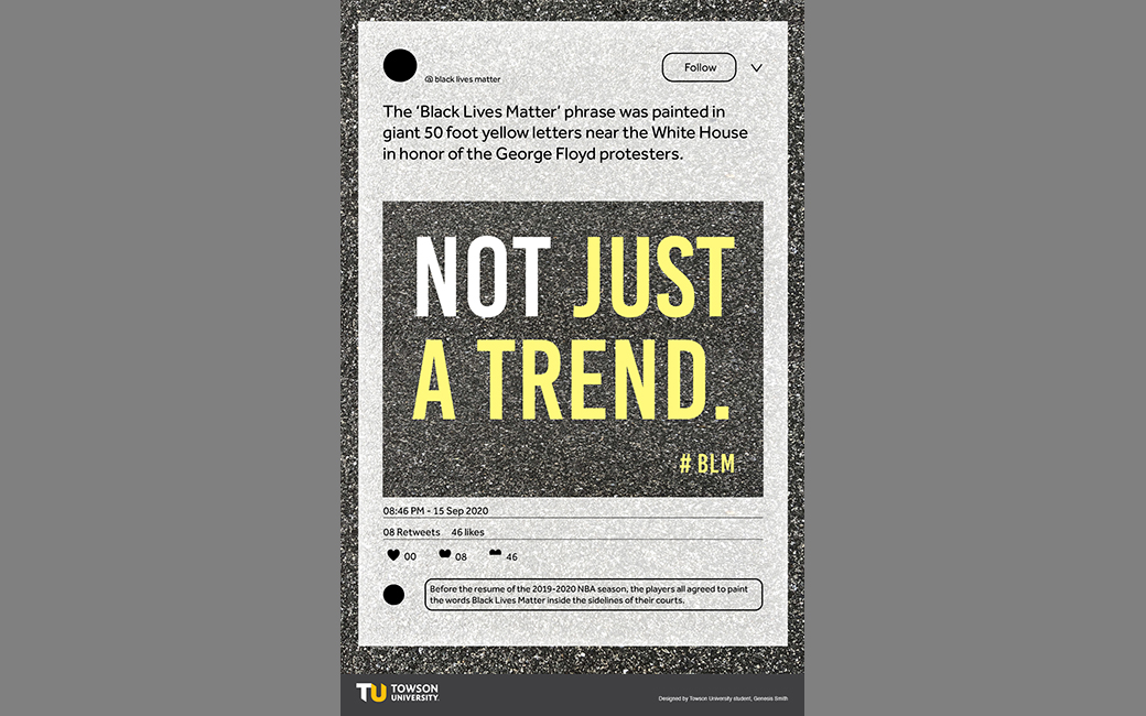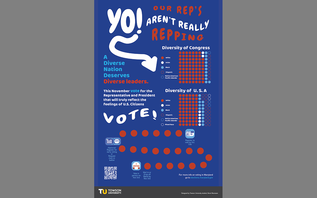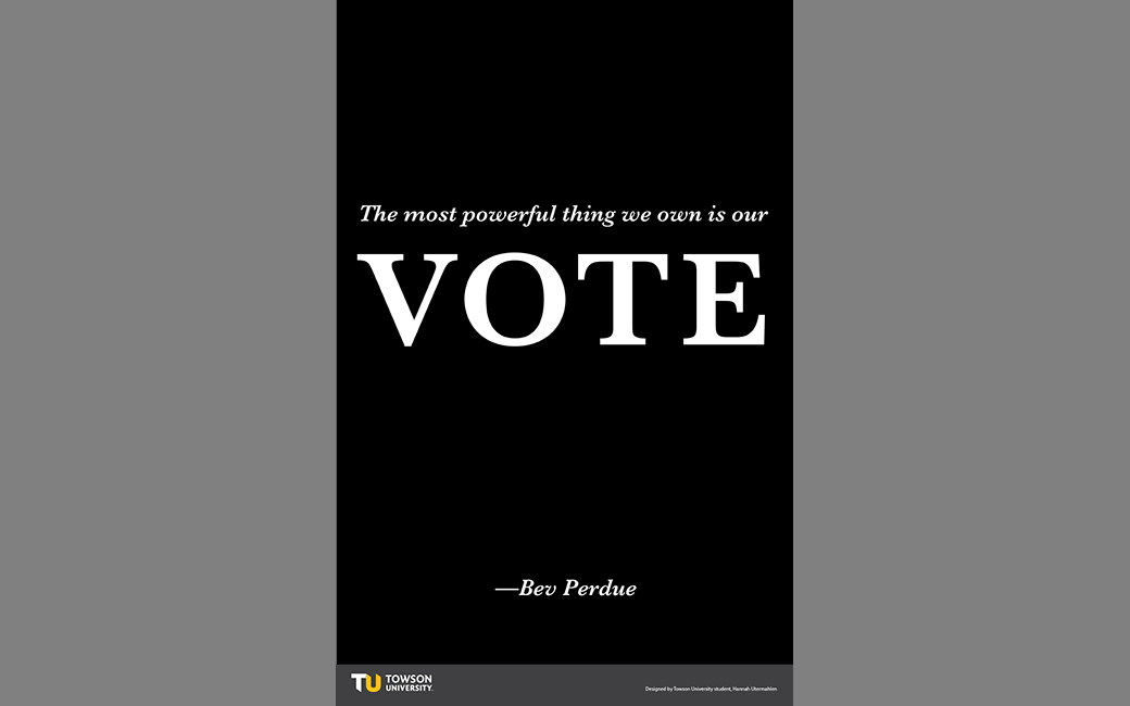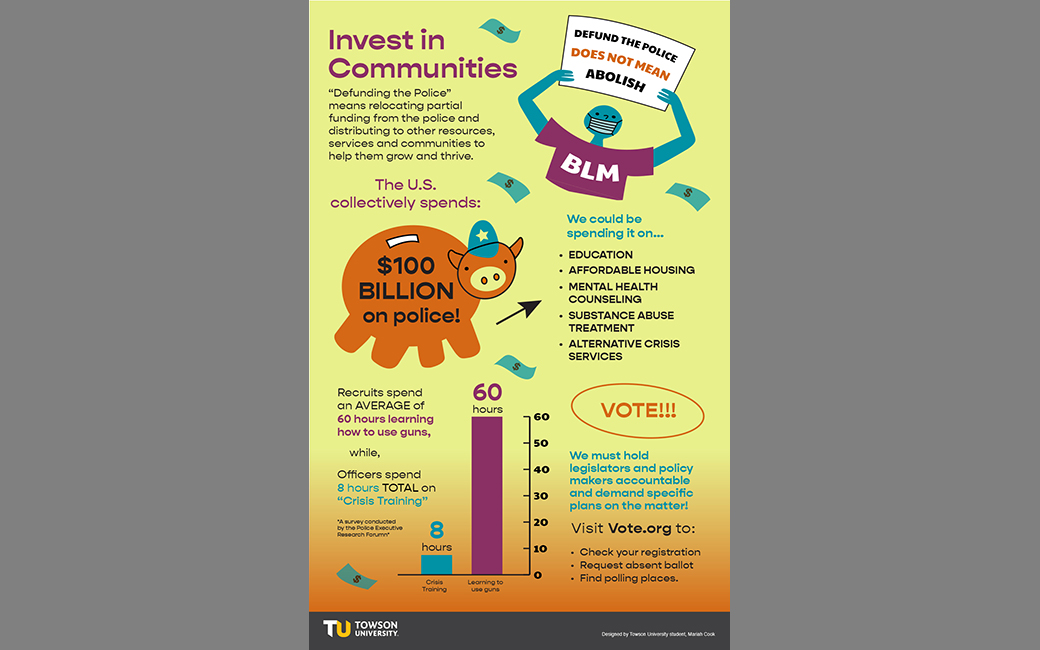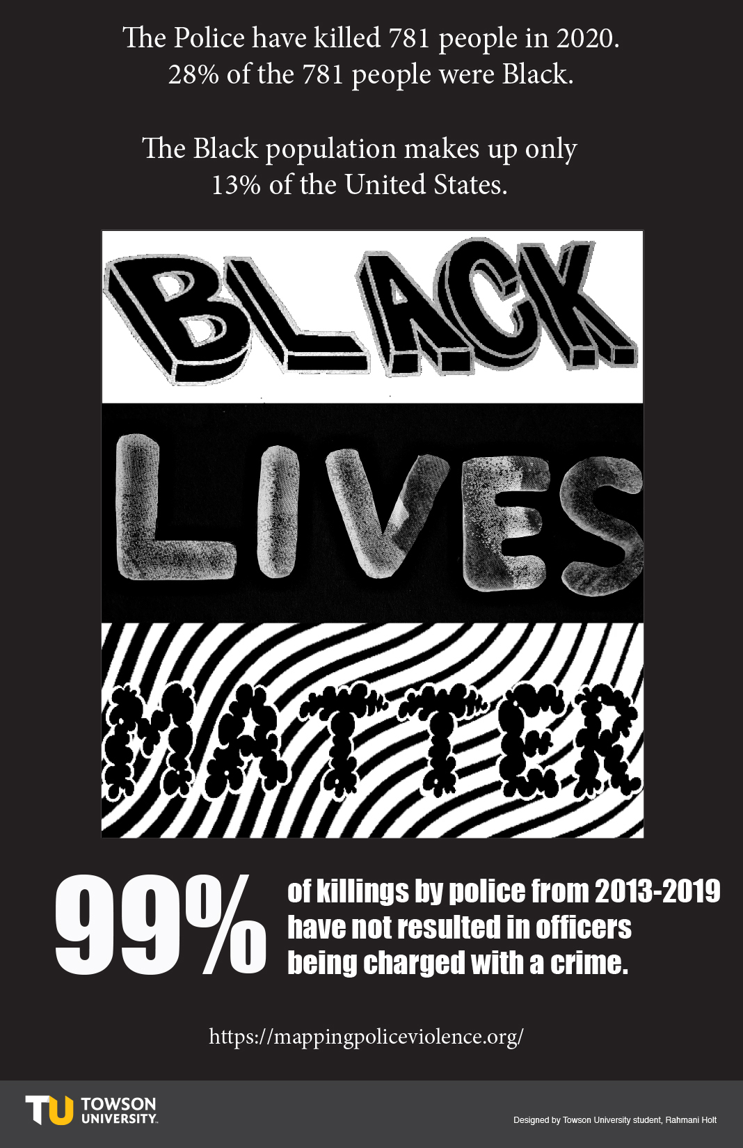 This fall, Towson University graphic design students are actively engaged in design citizenship; researching issues, listening, holding dialogue, and designing posters supporting the Black Lives Matter movement and voting in the 2020 election. Through the unique visual impact of posters, this exhibition seeks to inform, advocate, and call people to action.