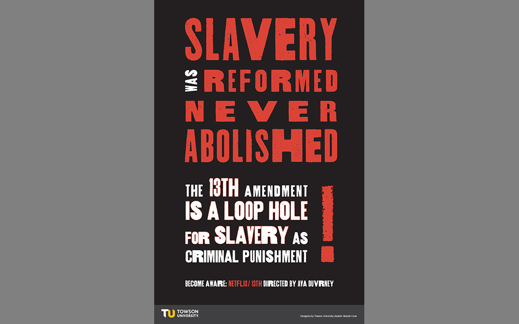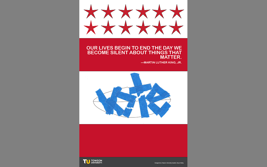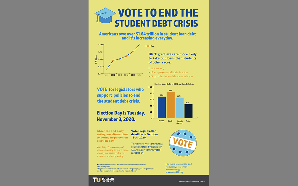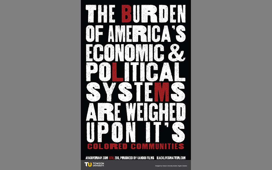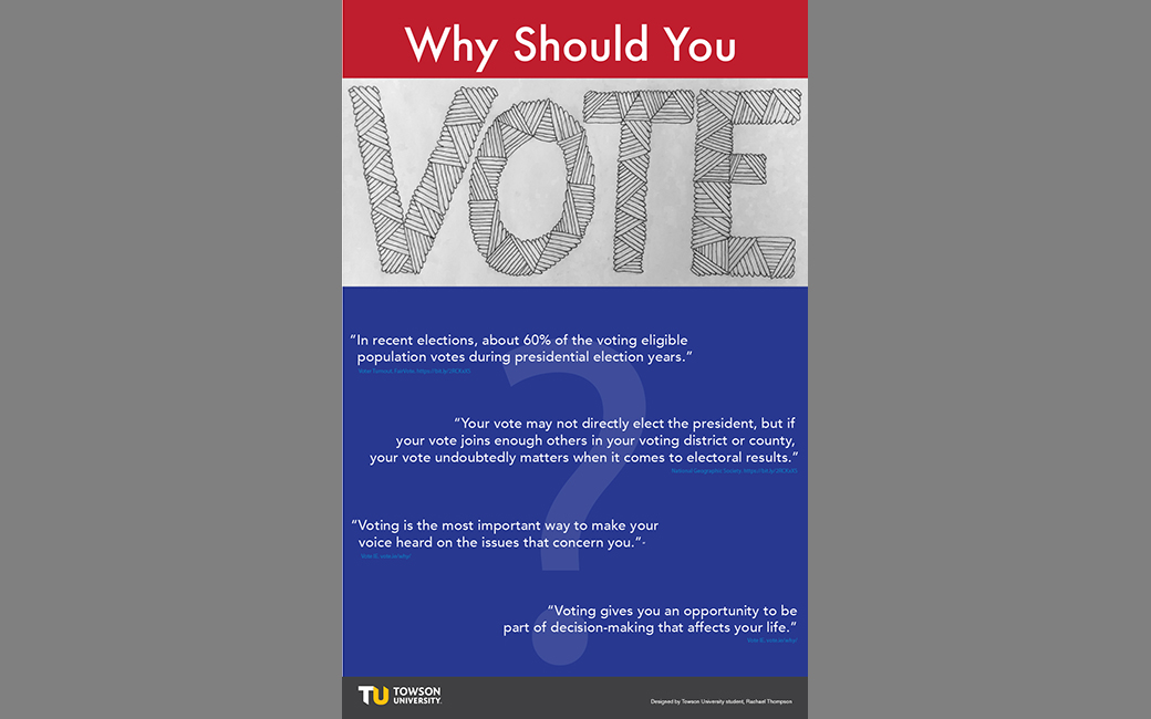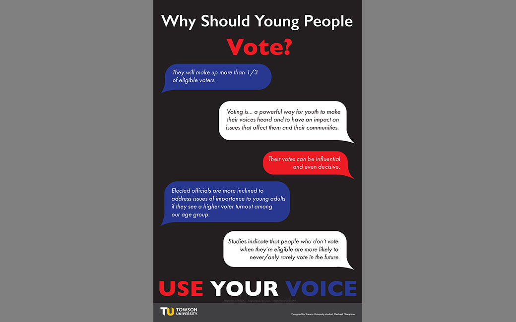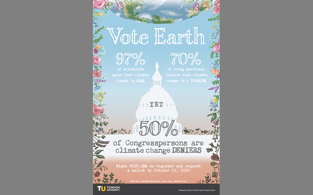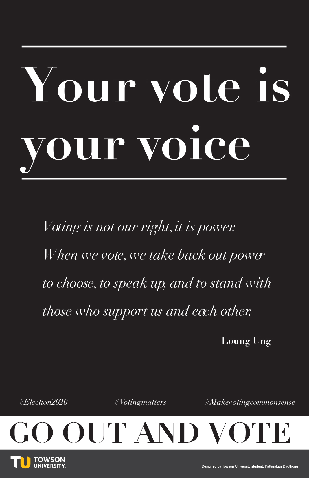 This fall, Towson University graphic design students are actively engaged in design citizenship; researching issues, listening, holding dialogue, and designing posters supporting the Black Lives Matter movement and voting in the 2020 election. Through the unique visual impact of posters, this exhibition seeks to inform, advocate, and call people to action.
