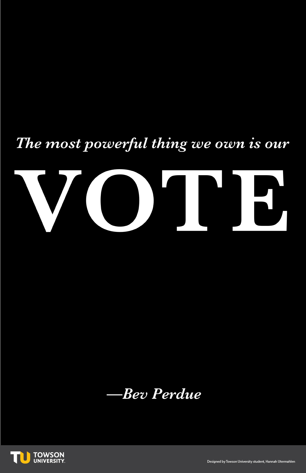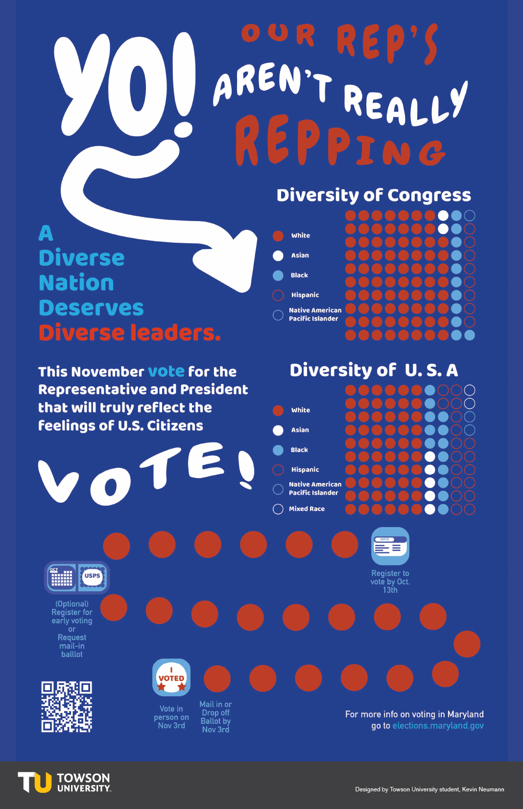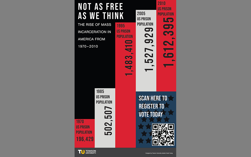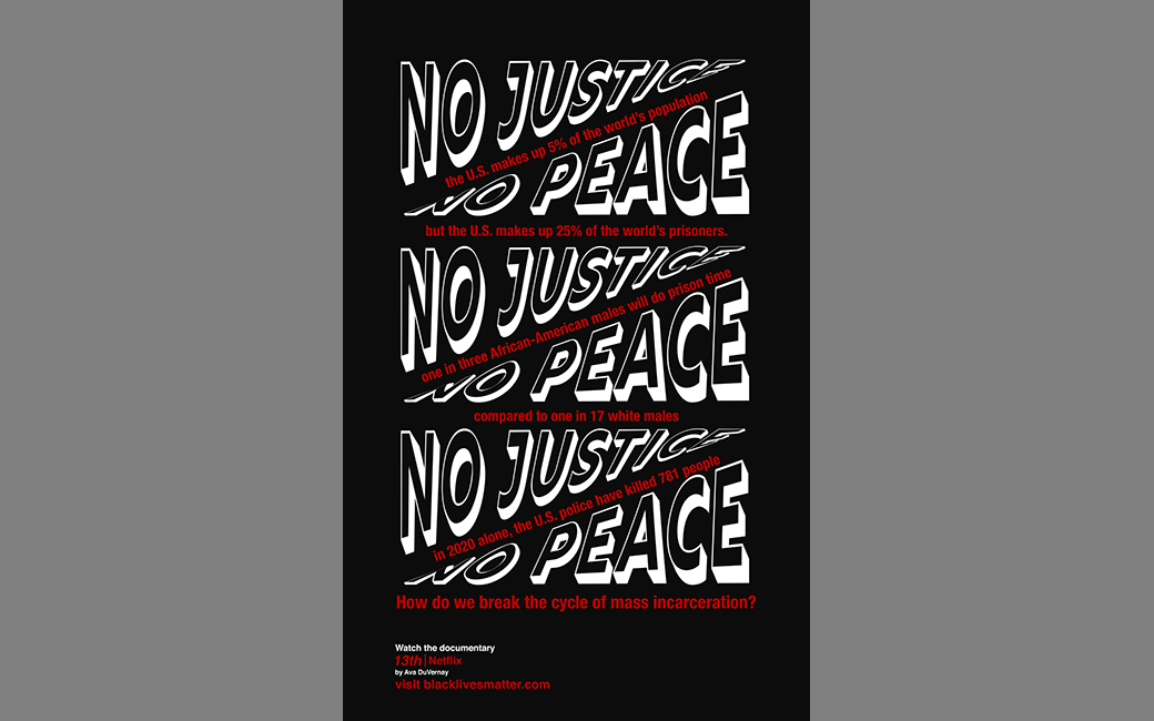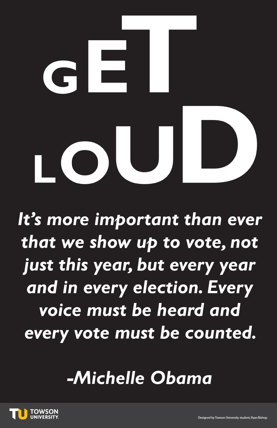This fall, Towson University graphic design students are actively engaged in design citizenship; researching issues, listening, holding dialogue, and designing posters supporting the Black Lives Matter movement and voting in the 2020 election. Through the unique visual impact of posters, this exhibition seeks to inform, advocate, and call people to action.