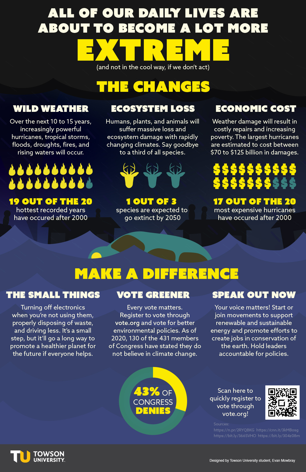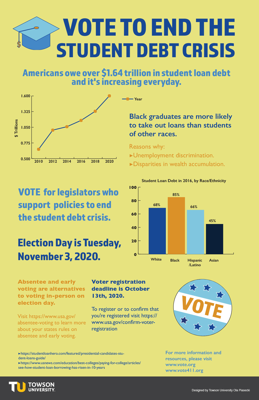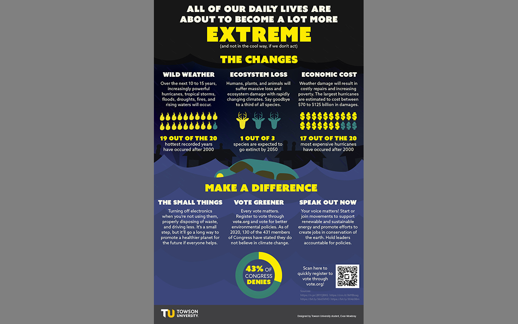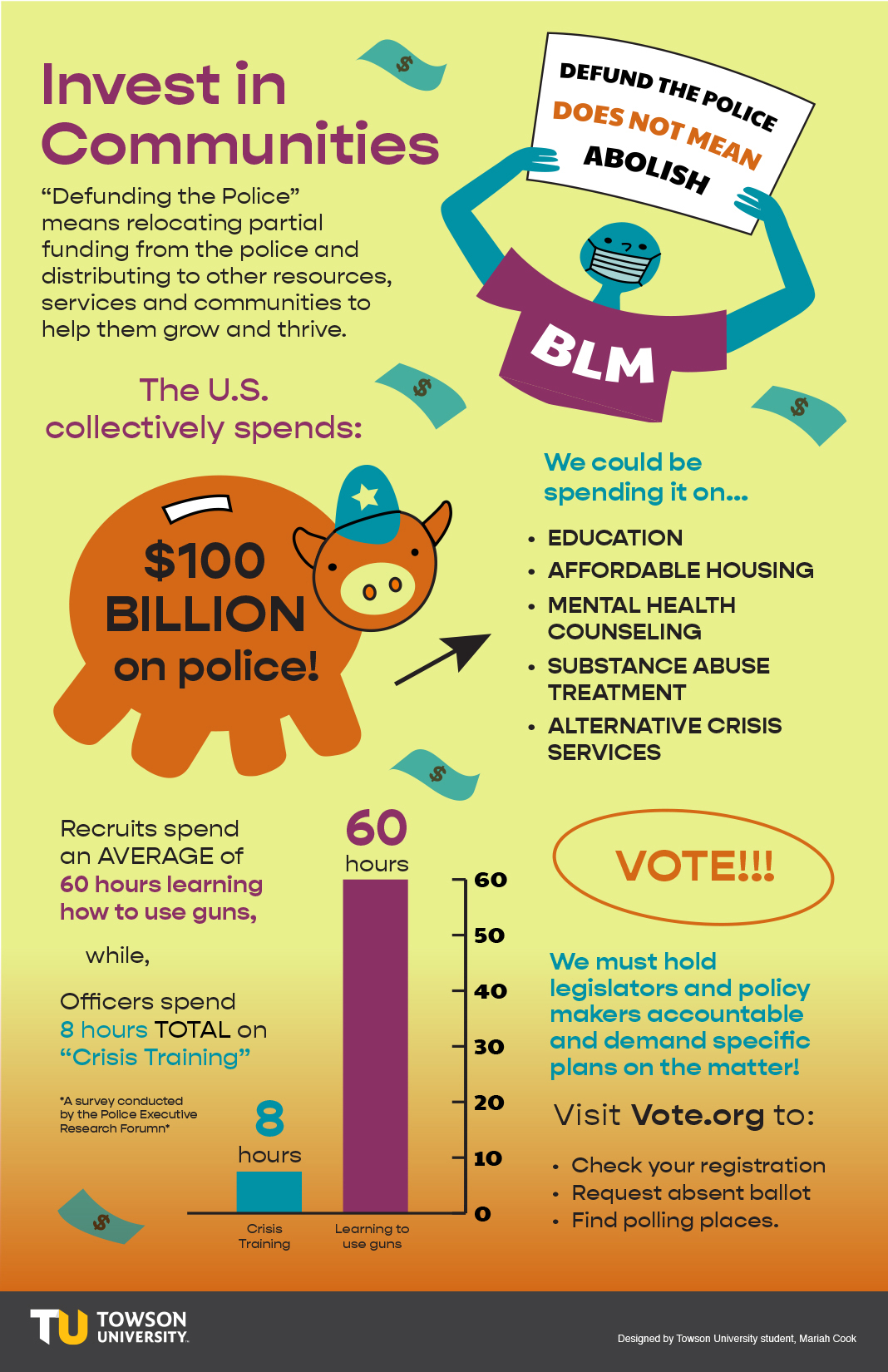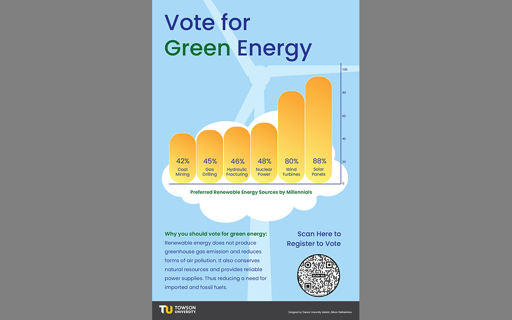 This fall, Towson University graphic design students are actively engaged in design citizenship; researching issues, listening, holding dialogue, and designing posters supporting the Black Lives Matter movement and voting in the 2020 election. Through the unique visual impact of posters, this exhibition seeks to inform, advocate, and call people to action.
