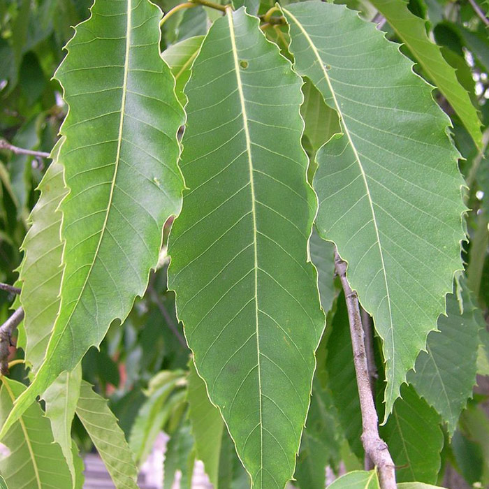 American Chestnut (Castanea dentata) — Once abundant throughout the state, the chestnut blight has killed virtually all of the trees. A hybrid cross that is 99% American chestnut is now available. (Image source: Fungus Guy, own work, CC BY-SA 3.0.)