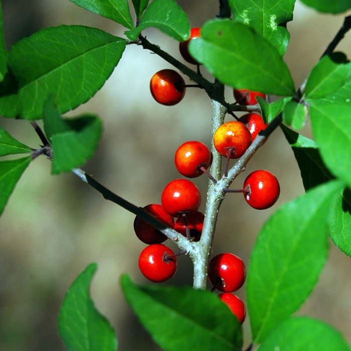 Possum Haw (Ilex decidua) — A small tree or shrub found in Southern Maryland. Related to American holly, it is deciduous and retains its bright red berries through the winter. Its male and female flowers are on different plants. (Image source: Jeremy Stovall.)
