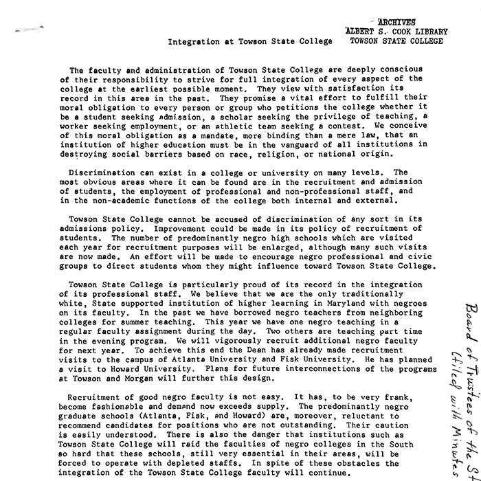 The faculty and administration of Towson State College are deeply conscious of their responsibility to strive for full integration of every aspect of the college at the earliest possible moment. They view with satisfaction its record in this area in the past. They promise a vital effort to fulfill their moral obligation to every person or group who petitions the college whether it be a student seeking admission, a scholar seeking the privilege of teaching, a worker seeking employment, or an athletic team seeking a contest. We conceive of this moral obligation as a mandate, more binding than a mere law, that an institution of higher education must be in the vanguard of all institutions in destroying social barriers based on race, religion, or national origin.