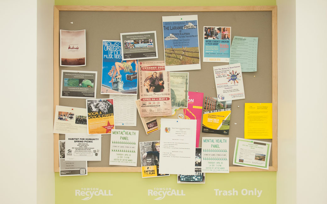 - Fliers whose events have taken place can be removed and placed in the appropriate bin (recycle or trash) below the cork boards.