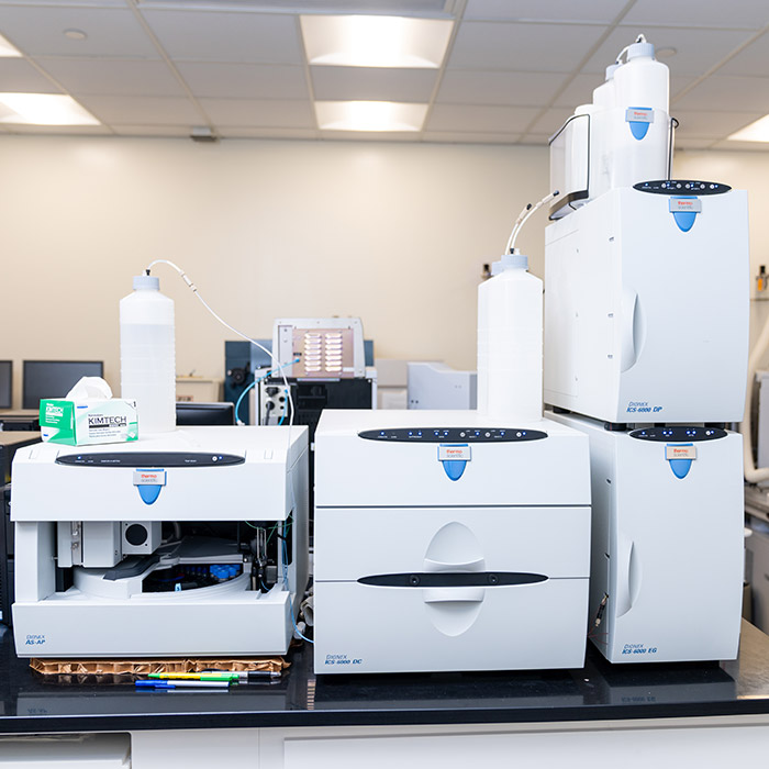 The Thermo ICS-6000 ion chromatograph characterizes and quantifies anions, such as chloride, nitrate, and sulfate, and cations, such as sodium, potassium, and calcium, in liquid samples. A Thermo AS-AP auto-sampler allows for random-access sampling and selection of injection volume.