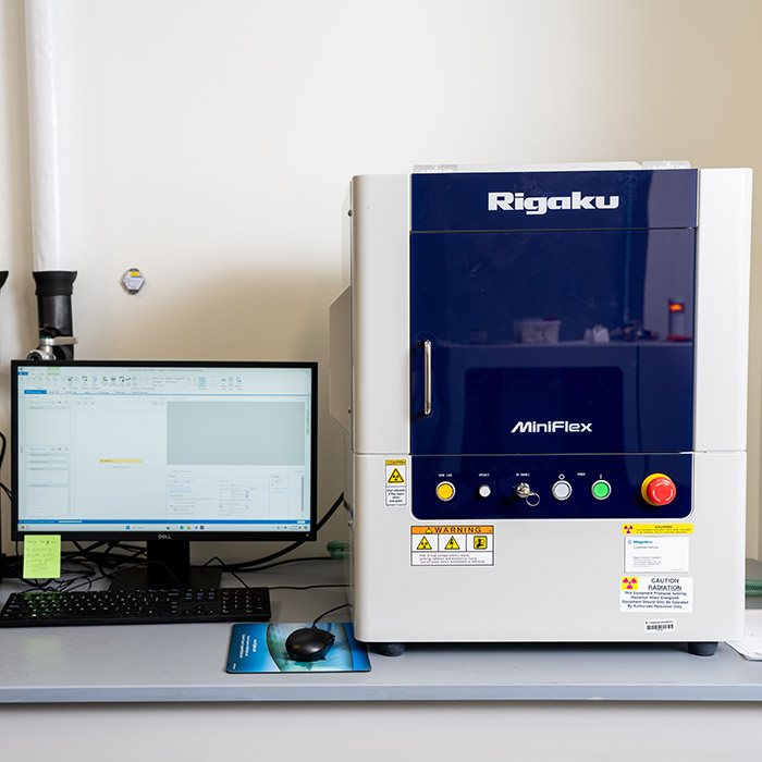 The Rigaku Miniflex tabletop X-Ray diffractometer (XRD) measures diffraction patterns for powdered samples, allowing for structural characterization of materials.