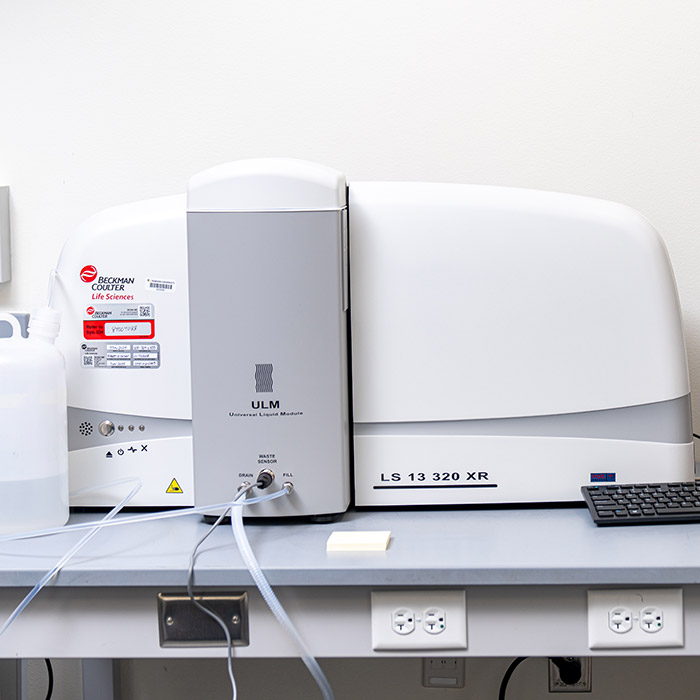 The Beckman-Coulter LS 13 320 XR Particle Size Analyzer measures the size distribution of particles suspended in liquid using the principles of light scattering.
