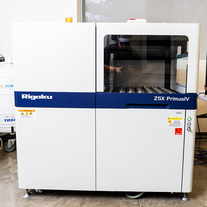 The Rigaku Primus IV wavelength-dispersive X-ray fluorescence spectrometer measures elemental concentrations from parts-per-million to weight percent. Samples are typically made into a glass fusion bead. Almost any material that can be prepared in this manner can be analyzed by the XRF. Analysis of pressed pellets or dissolved samples is also possible as is spatial mapping of small thin discs. A built-in auto-sampler allows for unattended operation.