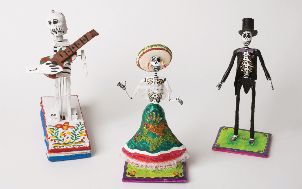 Day of the Dead is celebrated on November 1 and 2, when art like this is displayed on altars and in windows throughout the country. “It’s a time to remember the dead, but it’s also a time to realize your mortality and not be afraid of it,” Ramsdell says. “It’s also a time to make social commentary. In a way they’re making fun of people in high society. They’re very dressed up and elegant, but they’re skeletons. She looks like she thinks she’s really something, but she’s still mortal after all.”