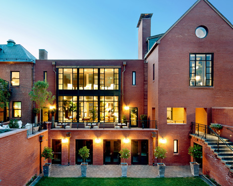 A historically compatible addition in the rear parking lot of the mansion and adjoining rowhomes enclosed an interior courtyard garden of lush green space for guests and diners.