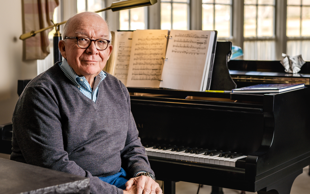 Bill Murray ’08, ’11 is perched on a black cushion atop the worn maroon one that covers the bench. As doctors, nurses, support staff, patients and visitors shuffle by, he continues to play. Occasionally EMTs pass pushing a person on a stretcher, and still, Murray plays. Everyone is wearing a mask, so it’s tough to tell when a few moments of a song elicit a warm feeling or smile—however fleeting—from a listener.