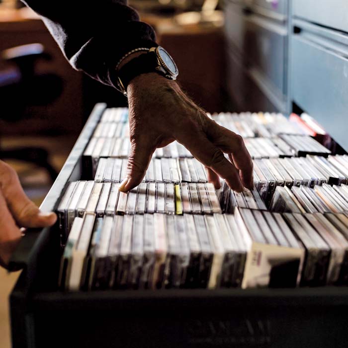 Down a flight of stairs is a den lined with bookshelves. He estimates he has more than 3,000 volumes on jazz and classical music, most of which he’s read. Up another flight of stairs is his recording studio, where he spends many of his waking hours at home. It’s packed with file cabinets containing most of his roughly 10,000 jazz CDs, which he believes is one of the biggest collections in the world. The rest are in the basement—he ran out of room upstairs.