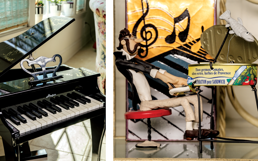 In the back of the house is a second living room, which is dominated by Murray’s collection of tiny, kitschy pianos he’s bought and been gifted from around the world. There are hundreds of them. One is a small rendition of a piano that’s actually a wine bottle holder. Another is a figurine playing a piano crafted from a tuna can. He got that one in the Bordeaux region of France.