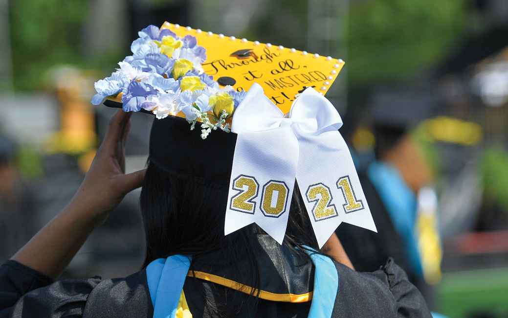 The 9,150 graduates sat in physically distanced seats spread across Minnegan Field. Family and friends attended in reduced capacity, sitting on both sides of the field. Still, roughly 35,000 guests attended the university’s first in-person ceremonies since December 2019.