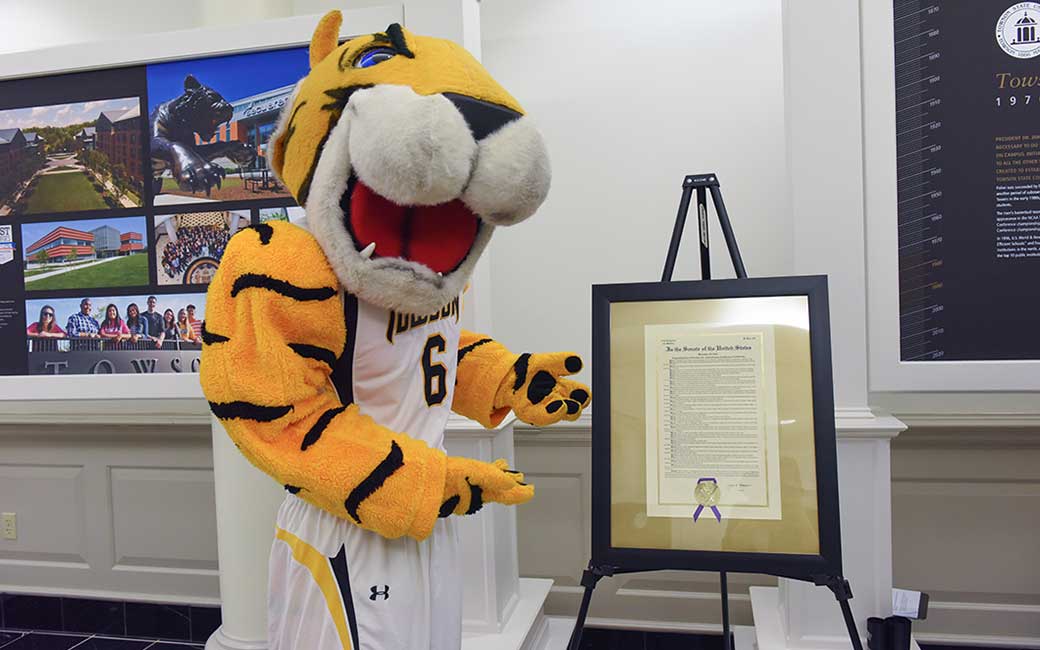 The display was more than metaphorical. The Miller Senate Office Building is now home to a stately and impressive narrative history of the university, installed on a series of panels that describe how Towson became the second-largest institution in the University System of Maryland. Standing on an easel is a resolution from the United States Senate acknowledging Towson’s long and storied journey toward what it is today.