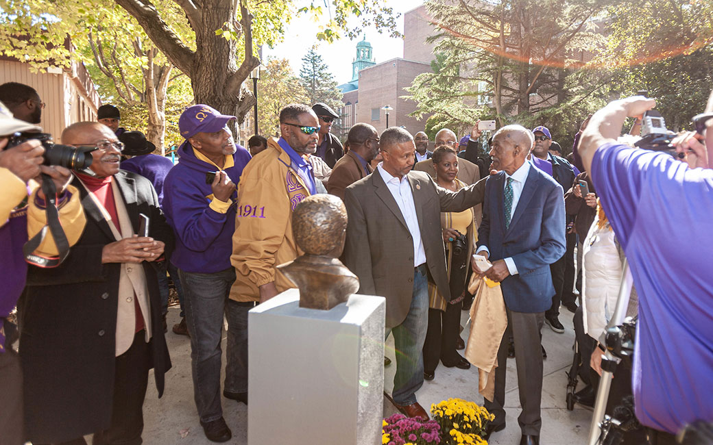 The feeling was mutual for the hundreds of people gathered outside TU's Media Center October 19 for an unveiling of a bronze bust in the likeness of Chapman, the University's first Dean of Minority Affairs. The bust was funded through the generosity of the brothers of Omega Psi Phi Fraternity Inc., Iota Epsilon Chapter. Chapman was the father of the group during his 1969-1981 tenure at what was then-Towson State. The bust is located just feet from a bench designated for Chapman last year.
